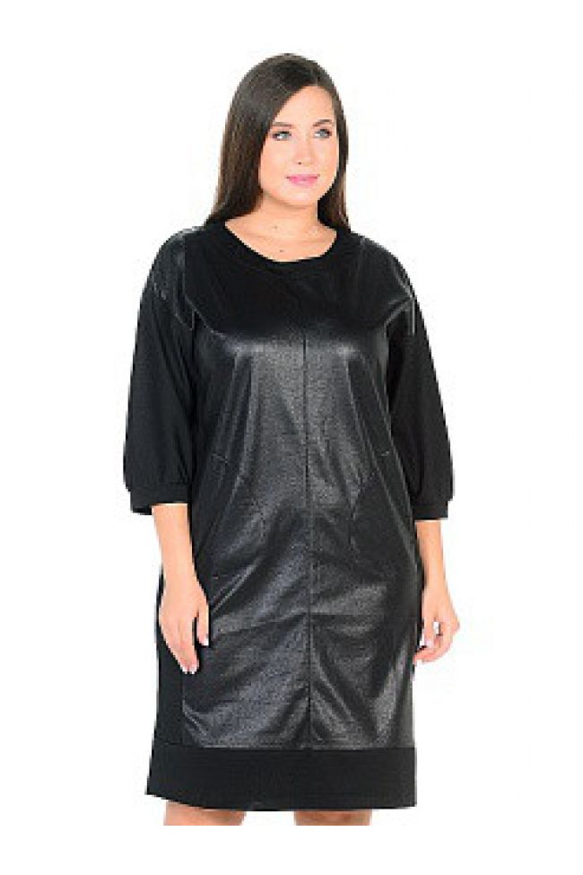 Лолита черный Комбинированное платье свободного силуэта. Выполнено из плотного трикотажного полотна. Центральная часть переда изготовлена из искусственной замши. Круглый вырез горловины обработан обтачкой. Цельнокроенные рукава удобной длины 3/4 с манжетой по низу. Карманы в рельефных швах переда с декоративной настрочкой. Платье с замшевыми вставками создаст смелый и  динамичный образ. Отличный выбор для вечеринки или встречи с подругами.