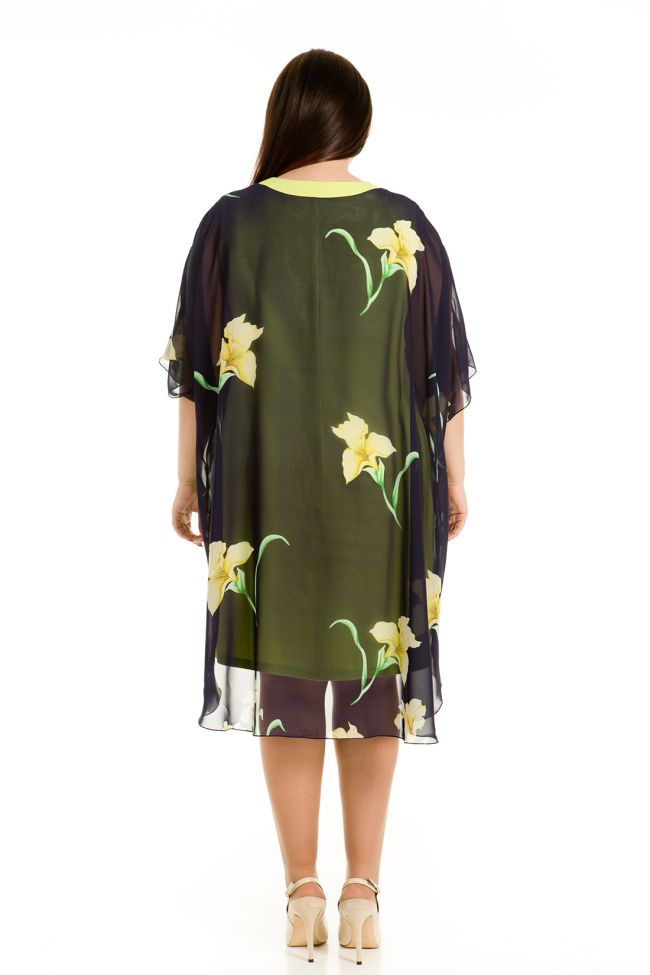 горчичный Оригинальное платье свободного силуэта длиной около колена. Модель выполнена из двух видов материалов: нижнее платье из плательной ткани стрейч, верхняя накидка из мягкого шифона яркой расцветки. Горловина обработана внешней обтачкой из однотонной ткани. Нижнее платье-футляр полуприлегающего силуэта с открытыми проймами, обработанными окантовкой. Верхняя накидка с цельнокроенным рукавом свободного силуэта, по низу обработана изящной закруткой. Платье прекрасно скрывает небольшие несовершенства и подчеркивает достоинства фигуры.
