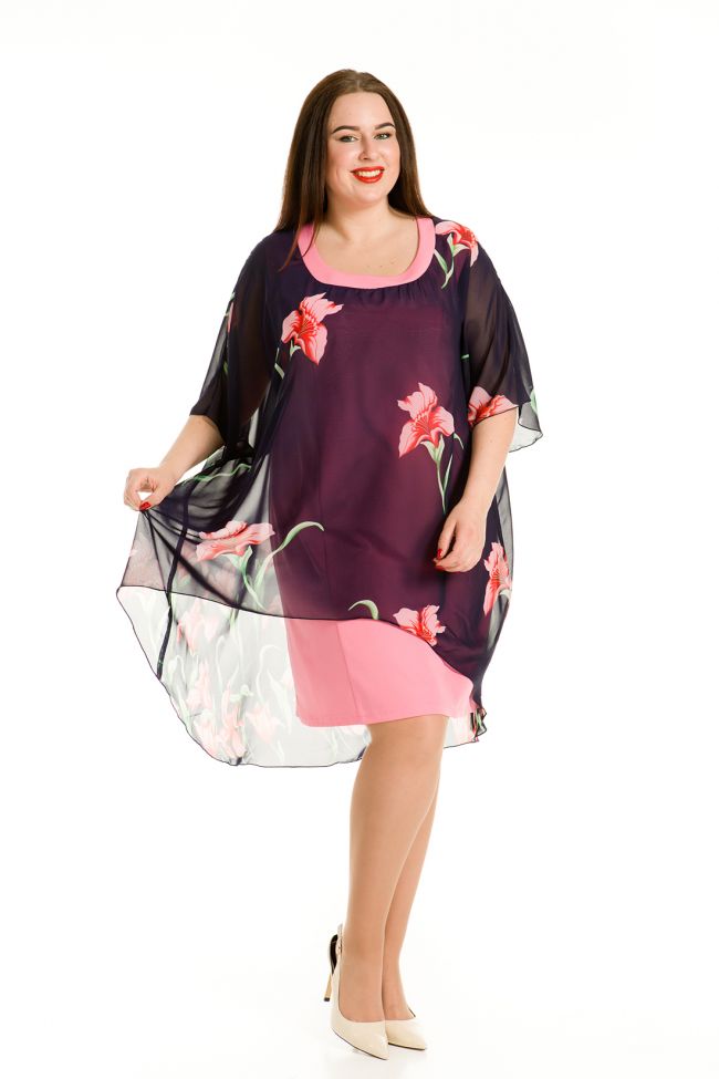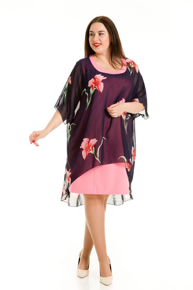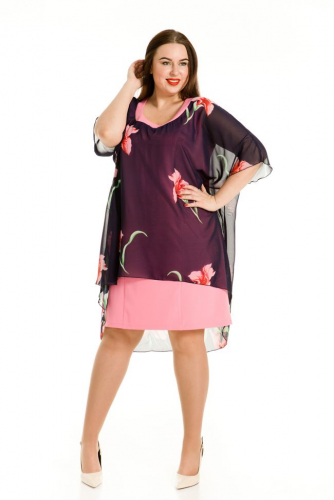 розовый Оригинальное платье свободного силуэта длиной около колена. Модель выполнена из двух видов материалов: нижнее платье из плательной ткани стрейч, верхняя накидка из мягкого шифона яркой расцветки. Горловина обработана внешней обтачкой из однотонной ткани. Нижнее платье-футляр полуприлегающего силуэта с открытыми проймами, обработанными окантовкой. Верхняя накидка с цельнокроенным рукавом свободного силуэта, по низу обработана изящной закруткой. Платье прекрасно скрывает небольшие несовершенства и подчеркивает достоинства фигуры.