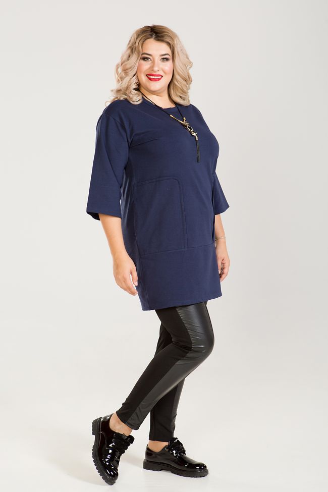 темно-синий Притягательное платье-туника прямого силуэта из хлопкового трикотажного полотна - футера. Круглый вырез горловины обработан притачной окантовкой, оставляет место под эффектное украшение. Втачные рукава длиной 3/4. Перед изделия декорирован крупными накладными карманами. По низу переда аккуратная притачная манжета. В этом платье Вы будете выглядеть женственно и нарядно.