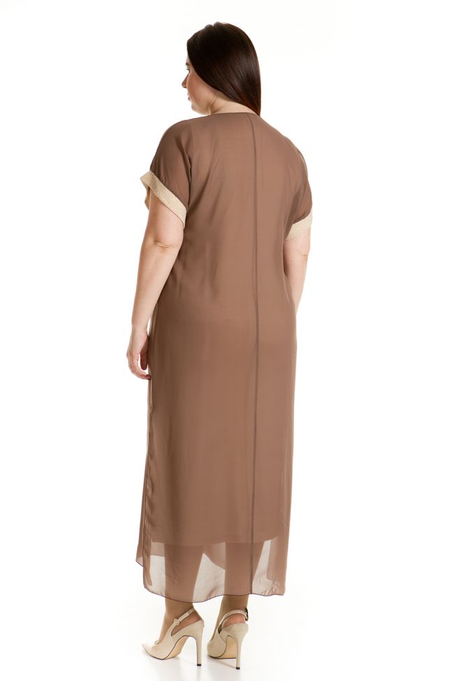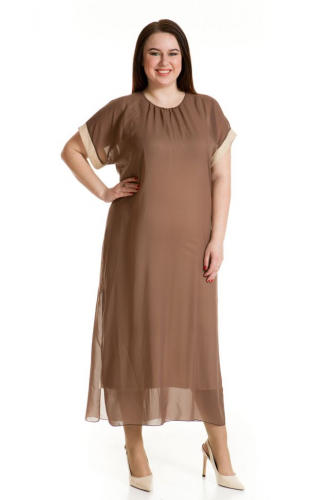 коричневый Стильное платье-макси прямого силуэта из однотонного легкого шифона. Подклад – приятная к телу вискоза. Круглый вырез горловины со сборкой добавляет платью оригинальности и отлично сочетается с различными украшениями. Укороченный цельнокроеный рукав оканчивается трикотажной манжетой с напылением. Высокие разрезы по бокам обеспечивают свободу движений. Платье-макси зрительно вытягивает силуэт, что придаёт особую стройность фигуре и акцентирует внимание на Вашей женственности.