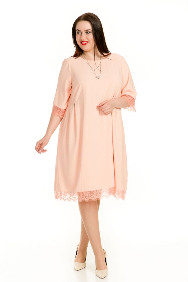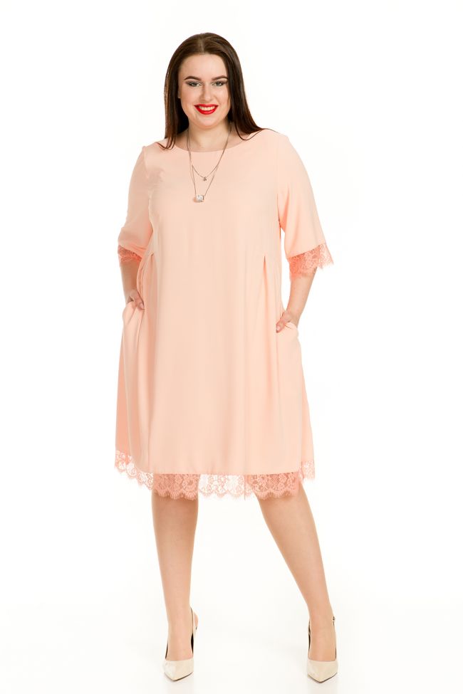 пудровый Очаровательное платье свободного силуэта из ткани " дубайский шелк" однотонной расцветки. Круглый вырез горловины обработан внутренней обтачкой. Втачные рукава длиной 3/4. По переду подрезной бочок, в области талии заложенный "бантовыми" складками. В боковых швах карманы. Низ изделия и рукава дополнены отделкой в тон из тончайшего кружева. Модель прекрасно подойдет обладательницам любых форм и сделает выход в свет женственным и романтичным.