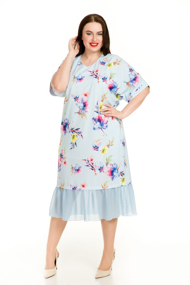 голубой Нарядное платье прямого силуэта из плательной ткани. V-образная горловина позволяет одеть любое украшение. Цельнокроенный рукав по нижнему срезу обработан внешней обтачкой. В боковых швах карманы. Нижний срез платья декорирован шифоновым воланом, что добавляет модели воздушности и нарядности! Платье на подкладе. Отличный вариант для летней вечеринки!