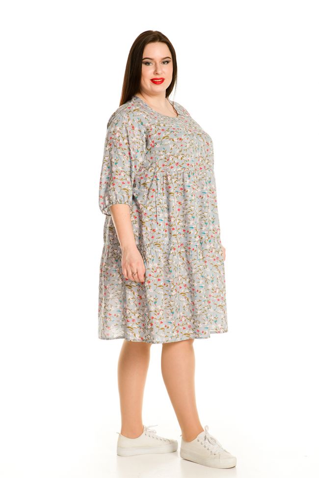 серый Комфортное платье свободного силуэта из штапельной ткани в мелкий цветочный принт. Спущенное плечо на прямоугольной пройме, укороченный рукав ¾, присборенный по низу на резинку. Круглый вырез горловины обработан окантовкой. Горизонтальные подрезы по переду и спинке дополнены мелкой сборкой. В боковом шве расположены карманы. Низ ровный, расклешен,без разрезов. Платье обеспечит свободу движений и поможет создать легкий повседневный образ.