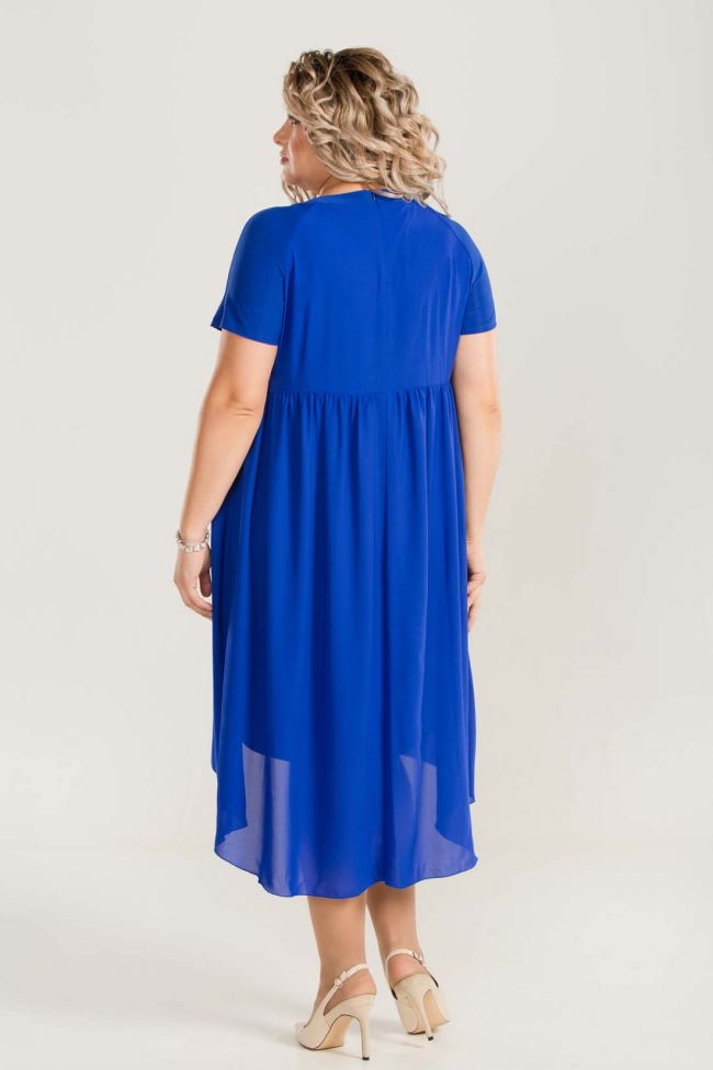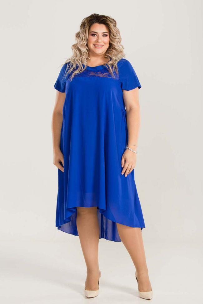 синий Очаровательное платье свободного силуэта из комбинированных тканей одного оттенка, на трикотажном подкладе. Основа -"креп шифон", кокетка переда - кружевное полотное.  Круглый вырез горловины обработан внешней обтачкой из пластичной ткани. Укороченные рукава -реглан, также выполнены из пластичного трикотажа "масло". По переду  горизонтальные подрезы в области талии, со сборкой по нижней детали. Спинка отрезная по линии талии, со сборкой по юбке. Низ ассиметричный. Платье зрительно удлиняет силуэт, прекрасно скрывает небольшие несовершенства и подчеркивает достоинства фигуры.