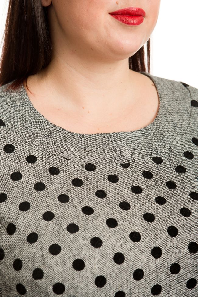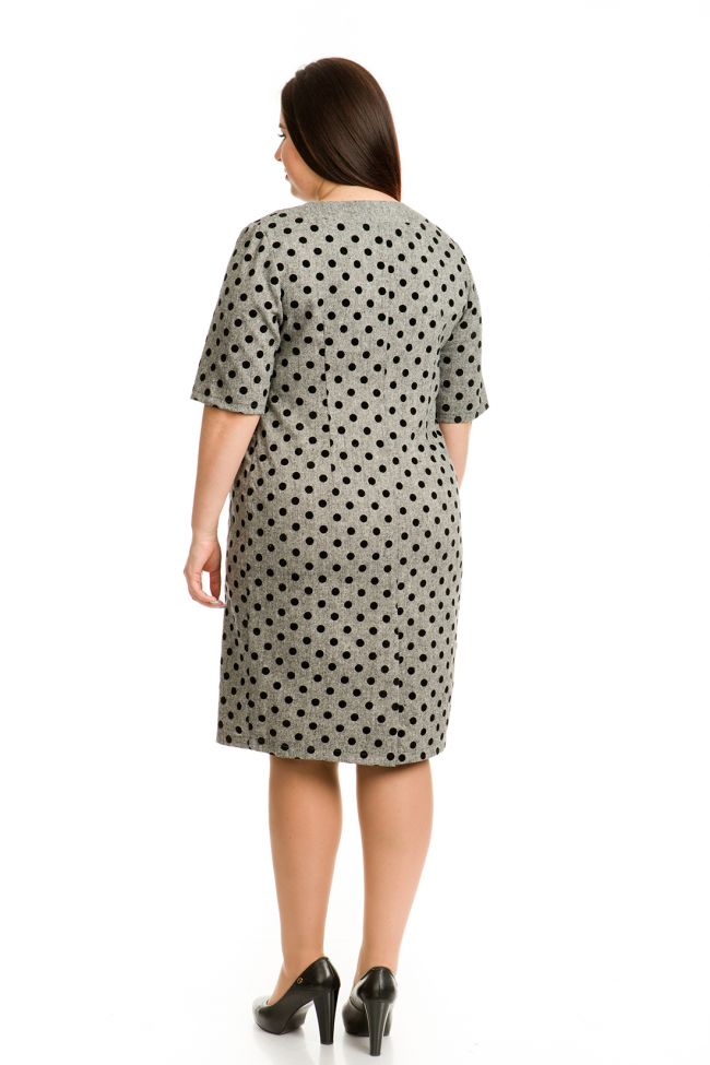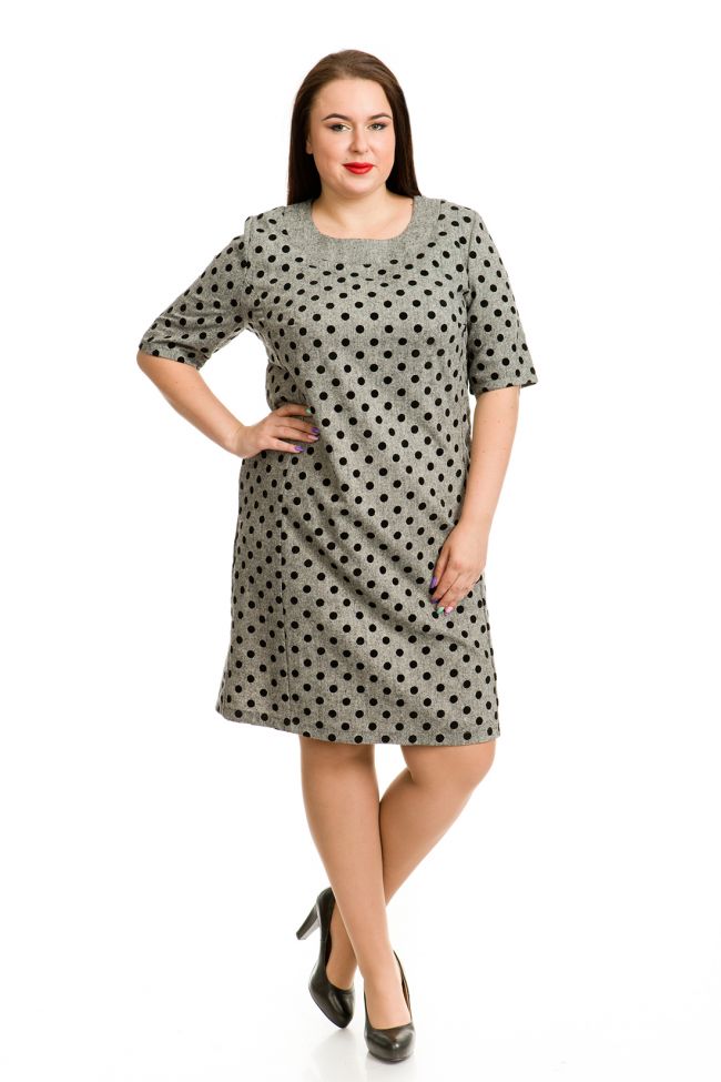 серый Деловое платье полуприлегающего  силуэта из полушерстяной ткани с бархатным принтом. Круглый вырез горловины  обработан обтачкой из ткани компаньона - однотон. Перед с вертикальными рельефами и вытачкой по груди. Спинка разрезная, для свободы движений в шве  расположена шлица. Укороченный втачной рукав. Низ ровный.  Отличный вариант для дополнения Вашего офисного или повседневного гардероба.