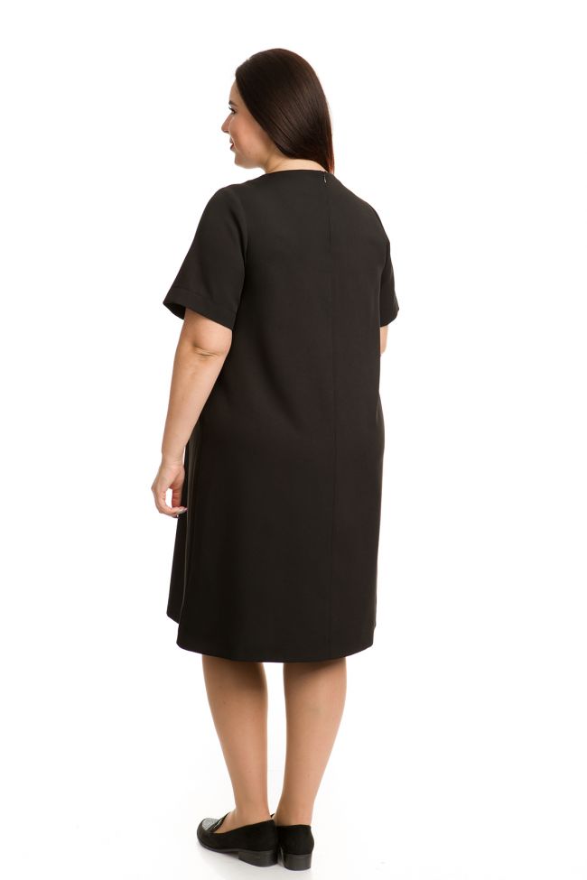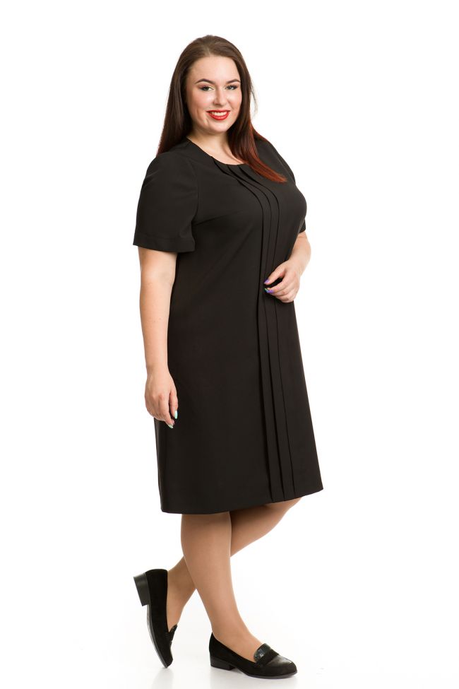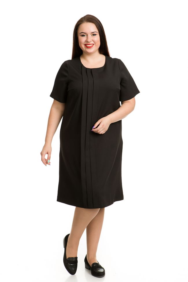 черный Деловое платье прямого силуэта из костюмно - плательной ткани "Барби". Круглый вырез горловины  обработан внутренней обтачкой. По переду отделка в виде 3 вертикальных складок по всей длине. Прилегание по груди за счет вытачек. Спинка разрезная, с застежкой на тесьму-молнию. Укороченный втачной рукав. Низ ровный.  Аккуратное черное платье - отличный вариант для дополнения Вашего офисного или повседневного гардероба.
