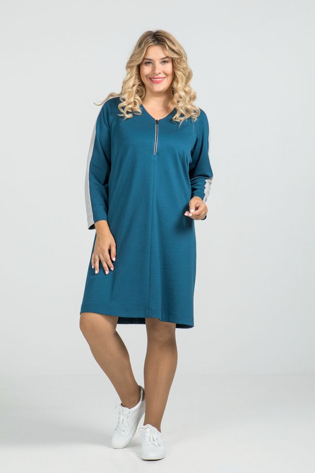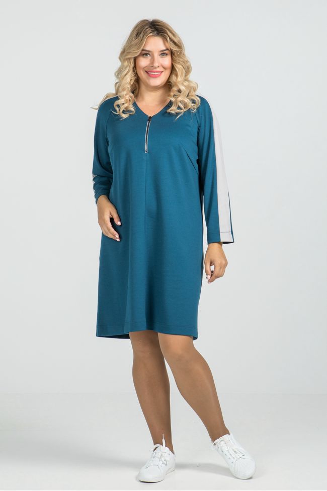 бирюзовый Комфортное платье в спортивном стиле прямого силуэта из трикотажного полотна "джерси". V-образный вырез горловины дополнен контрастной молнией.  Прилегание по груди за счет вытачек. Спинка разрезная. Длинные рукава - полуреглан, дополнены лампасами в одной цветовой гамме с молнией. Низ ровный,без разрезов.  Отличный вариант для Вашего удобного  повседневного гардероба.