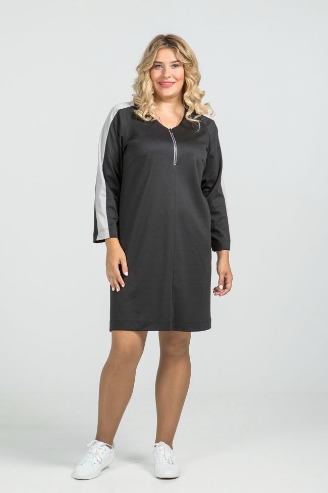 черный Комфортное платье в спортивном стиле прямого силуэта из трикотажного полотна "джерси". V-образный вырез горловины дополнен контрастной молнией.  Прилегание по груди за счет вытачек. Спинка разрезная. Длинные рукава - полуреглан, дополнены лампасами в одной цветовой гамме с молнией. Низ ровный,без разрезов.  Отличный вариант для Вашего удобного  повседневного гардероба.