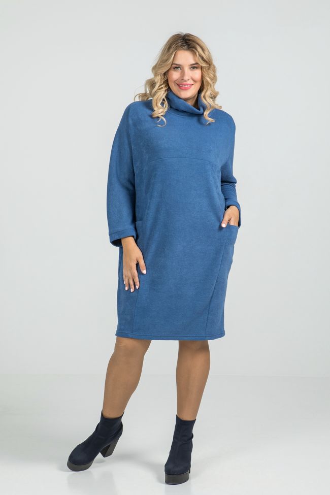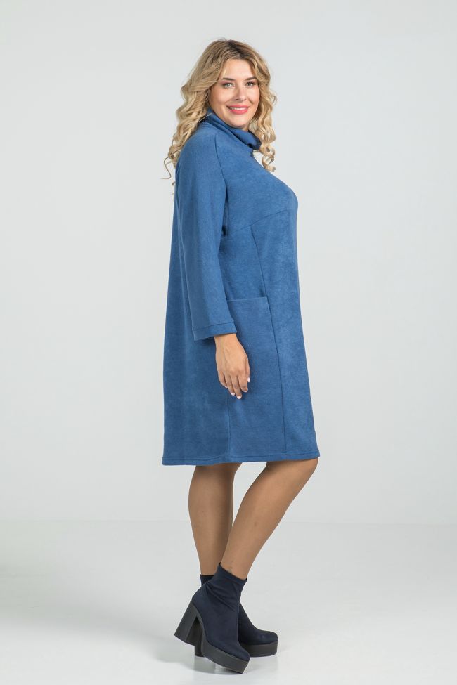 голубой Современное платье свободного силуэта из рыхлого трикотажного полотна "ангора". Перед с кокеткой и вертикальными рельефами, дополнен горизонтальными цельнокроенными карманами.  Удобные цельнокроенные рукава, длиной 7\8 обеспечат свободу движений. Спинка со швом по центру. Круглая горловина с воротником "хомут". Низ ровный. Платье прекрасно дополнит повседневный гардероб в прохладное время года.