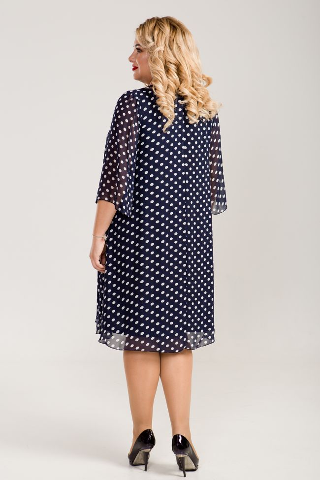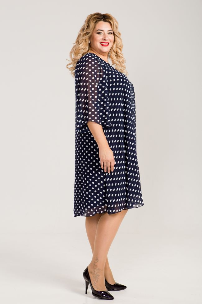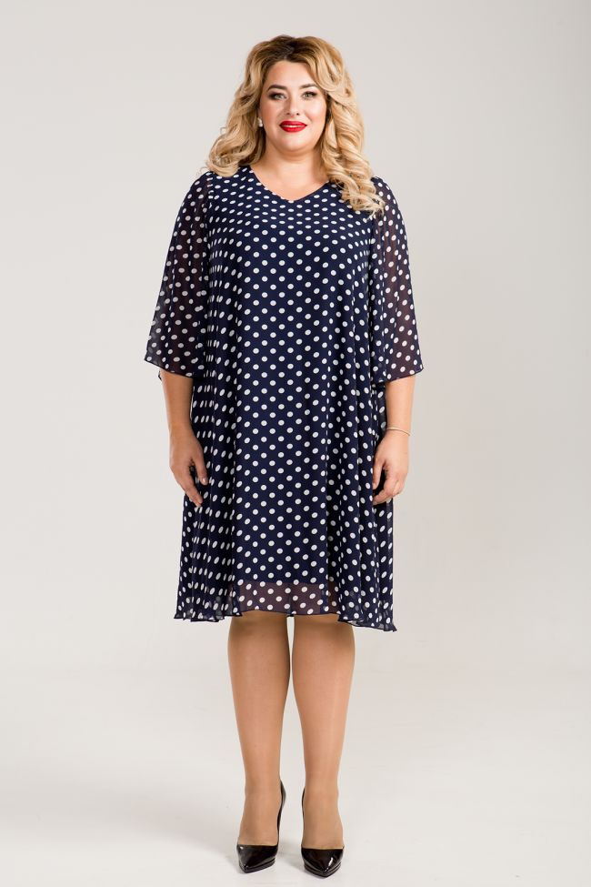 синий Женственное платье A-образного силуэта из шифона принт "горох", на подкладе "трикотаж". V-образный вырез горловины позволяет украсить зону декольте любым украшением. Рукава втачные расклешенные, длиной 7/8. Легкое платье обеспечит свободу движений и поможет создать легкий романтичный образ. Декор в комплект не входит.