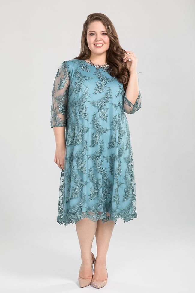 сине-зеленый Праздничное, комбинированное платье А-образного силуэта. Верх из кружевного полотна, нижний слой из трикотажного полотна. Силуэтная форма решена за счет рельефных швов переда и спинки. Спинка разрезная, в шве застежка на тесьму-молнию. Круглый вырез  горловины обработан внутренней обтачкой. Втачные рукава  из кружева, длиной за локоть. Платье поможет создать интересный вечерний образ.