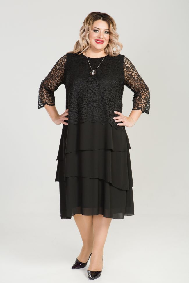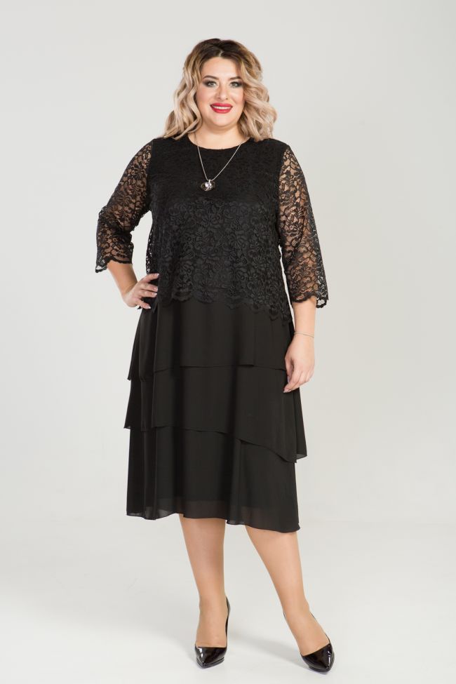 черный Оригинальное многослойное платье А-силуэта из двух видов тканей. Перед и спинка из кружевного полотна на подкладе. Круглый вырез горловины обработан изнутри. Втачные кружевные рукава длиной 3/4. Юбка спинки и переда выполнена из шифона в три ассиметричных слоя. Низ ровный. Крой платья отлично подойдет дамам с любым типом фигуры. Платье отлично будет смотреться в торжественной обстановке.