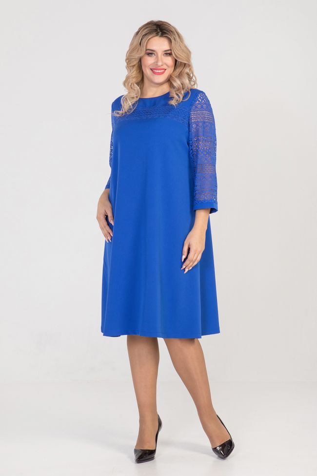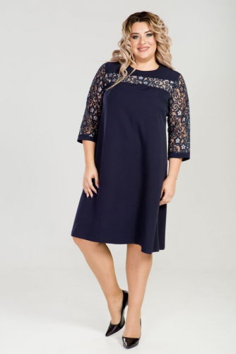 синий Женственное комбинированное платье А-образного силуэта. Модель выполнена из костюмно-плательной ткани "Барби". Перед с отрезной кокеткой, дополнен широкой  кружевной вставкой дублированной тканью в цвет основы. Спинка со швом по центру, с застежкой на тесьму - молнию. Круглая горловина, обработана внутренней обтачкой. Втачные рукава из кружевного полотна, по низу дополнены узкой манжетой. Низ изделия ровный, слегка расклешенный. Отличный выбор для торжественных случаев.
