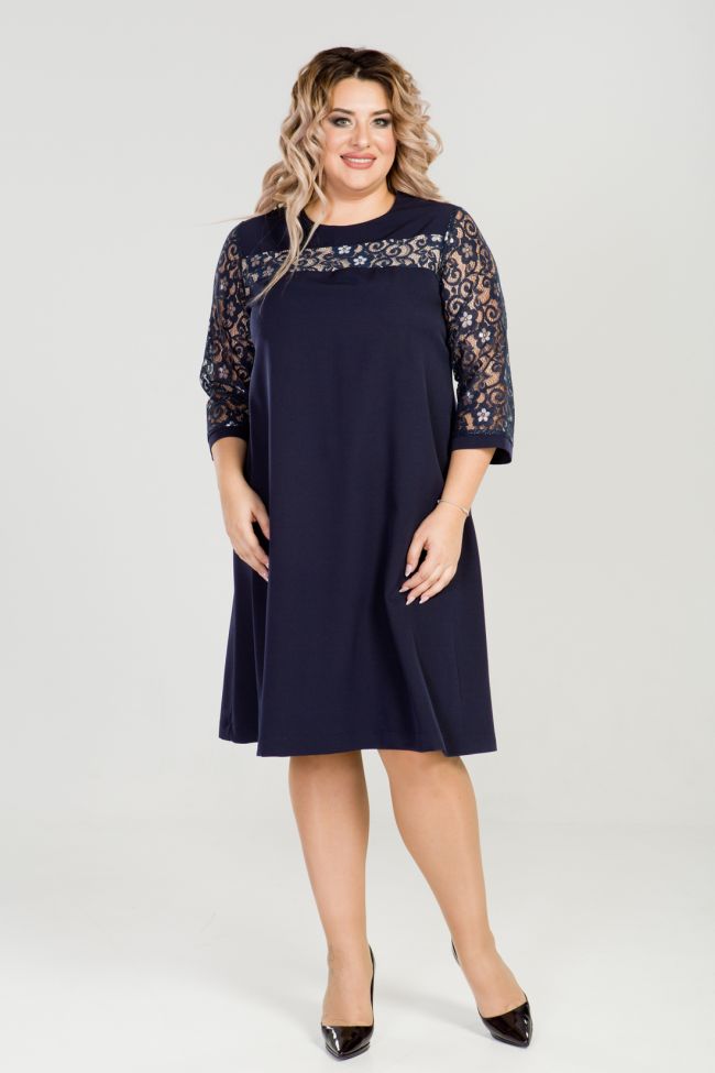 темно-синий Женственное комбинированное платье А-образного силуэта. Модель выполнена из костюмно-плательной ткани "Барби". Перед с отрезной кокеткой, дополнен широкой  кружевной вставкой дублированной трикотажем телесного цвета. Спинка со швом по центру, с застежкой на тесьму - молнию. Круглая горловина, обработана внутренней обтачкой. Втачные рукава из кружевного полотна, по низу дополнены узкой манжетой. Низ изделия ровный, слегка расклешенный. Отличный выбор для торжественных случаев.