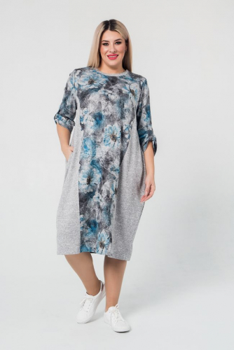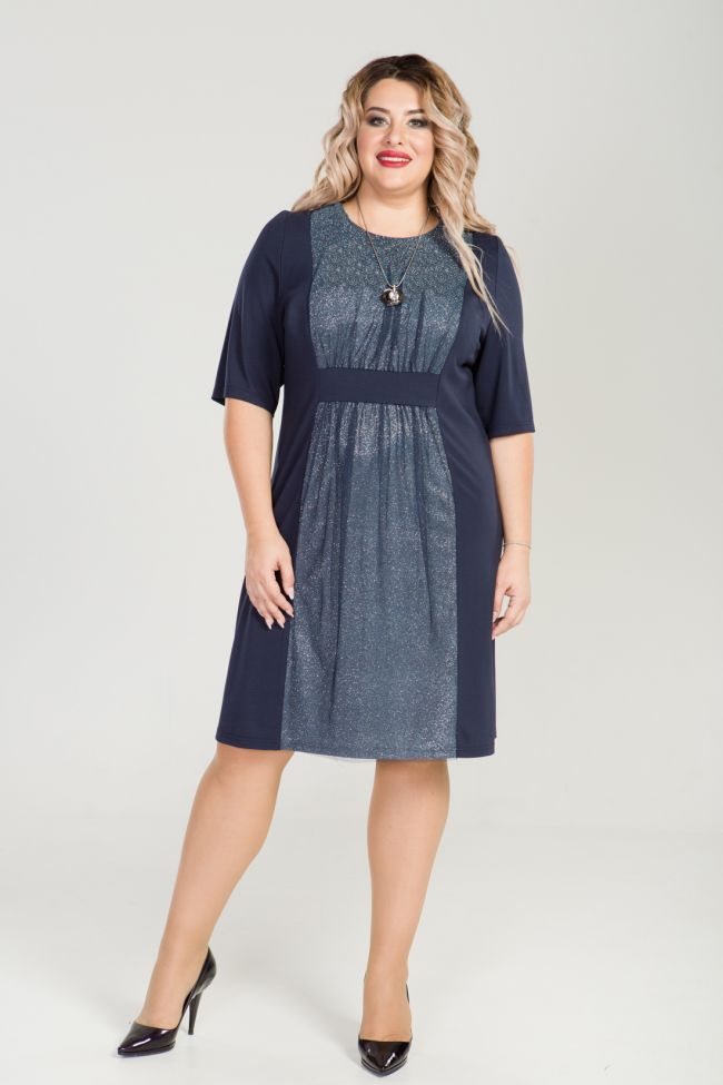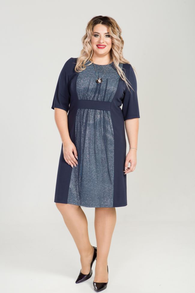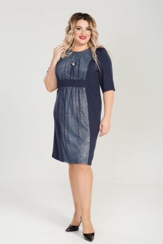 синий Очаровательное платье приталенного силуэта из трикотажного полотна однотонной расцветки. Перед с вертикальными рельефами. По центру переда оригинальная двойная вставка: верх-сетка, нижний слой-трикотаж с люрексом. Вставка разделена на лиф и юбку, присборена и зафиксирована притачной деталью имитирующей поясок. Круглый вырез горловины обработан внутренней обтачкой. Втачные рукава,  длиной за локоть, открывают изящные линии рук. Спинка дополнена вытачками. Низ ровный. Женственное и романтичное платье для особых случаев.