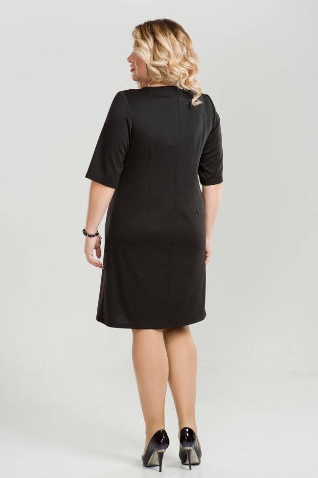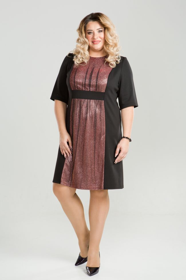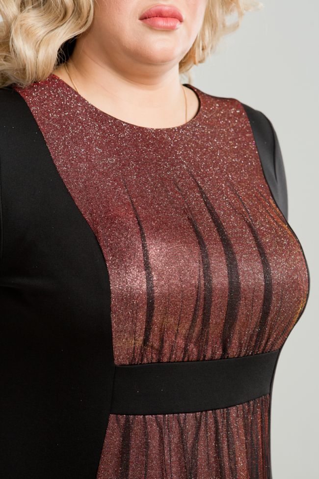 черный Очаровательное платье приталенного силуэта из трикотажного полотна однотонной расцветки. Перед с вертикальными рельефами. По центру переда оригинальная двойная вставка: верх-сетка, нижний слой-трикотаж с люрексом. Вставка разделена на лиф и юбку, присборена и зафиксирована притачной деталью имитирующей поясок. Круглый вырез горловины обработан внутренней обтачкой. Втачные рукава,  длиной за локоть, открывают изящные линии рук. Спинка дополнена вытачками. Низ ровный. Женственное и романтичное платье для особых случаев.