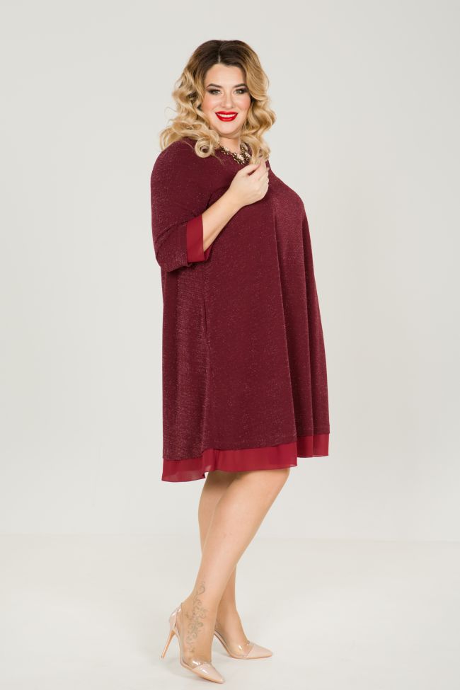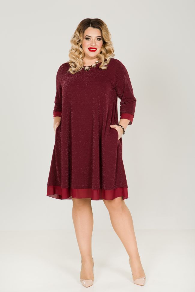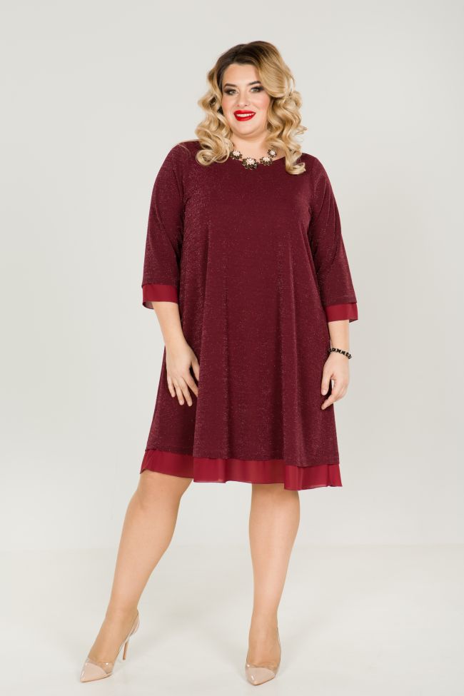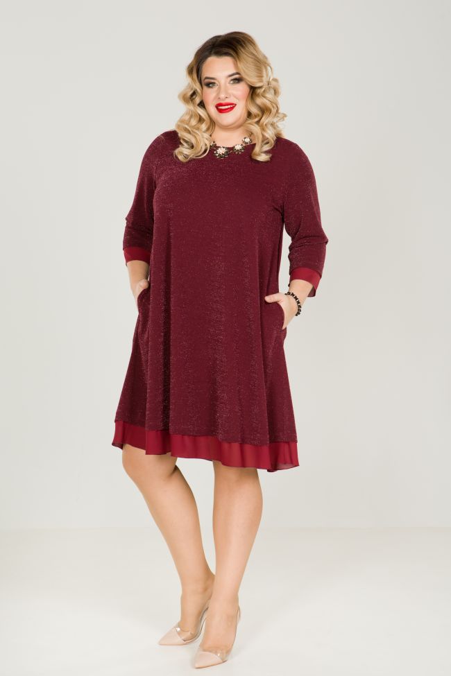бордовый Интересное платье А-образного силуэта из  трикотажного полотна "люрекс" , в виде отделки по низу изделия и рукавам - шифон. Модель с круглым вырезом горловины, оставляющим место под эффектное украшение. Втачные рукава 7/8 с манжетой.  В боковых швах -  удобные карманы. Низ прямой. Платье свободного кроя обеспечит свободу движения и комфорт, подойдет девушкам с любым типом фигуры.