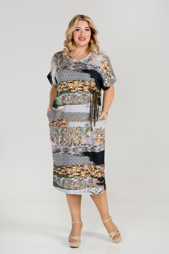 зеленый Платье свободного силуэта из вискозной ткани в принт.  V-образный вырез горловины дополнен отложным воротничком. Прилегание по груди за счет  вытачек. По переду слева - декоративный поясок из репсовой ленты. Цельнокроеные укороченные рукава, дополнены широкой манжетой. Спинка со швом по центру. Низ прямой, в боковых швах удобные карманы, по низу разрезы.   Отличный выбор для встреч с друзьями и повседневного выхода.