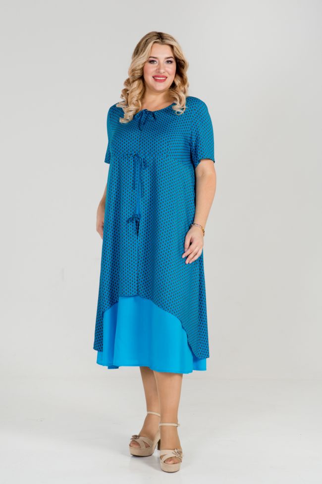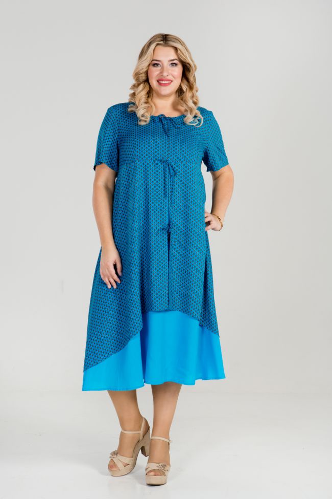 синий Эффектное платье трапециевидного силуэта из двух видов хлопковой ткани. Круглый вырез горловины. В области талии горизонтальный подрез, юбка двойная. Верхний слой с ассиметричным низом, нижний слой юбки с прямым низом. Интересное решение по центру переда - декоративные завязки. Короткий втачной рукав. Отличный вариант для летних прогулок. Необычное решение переда не оставит Вас незамеченной!