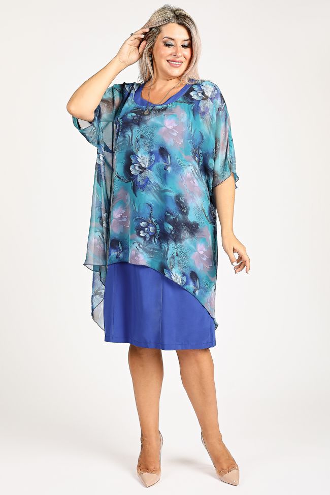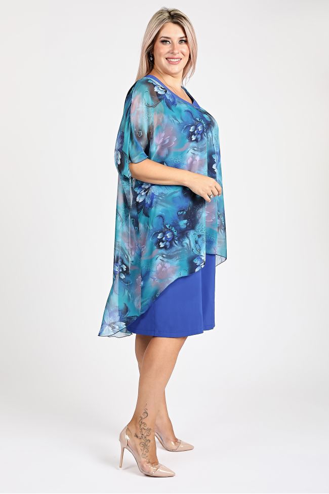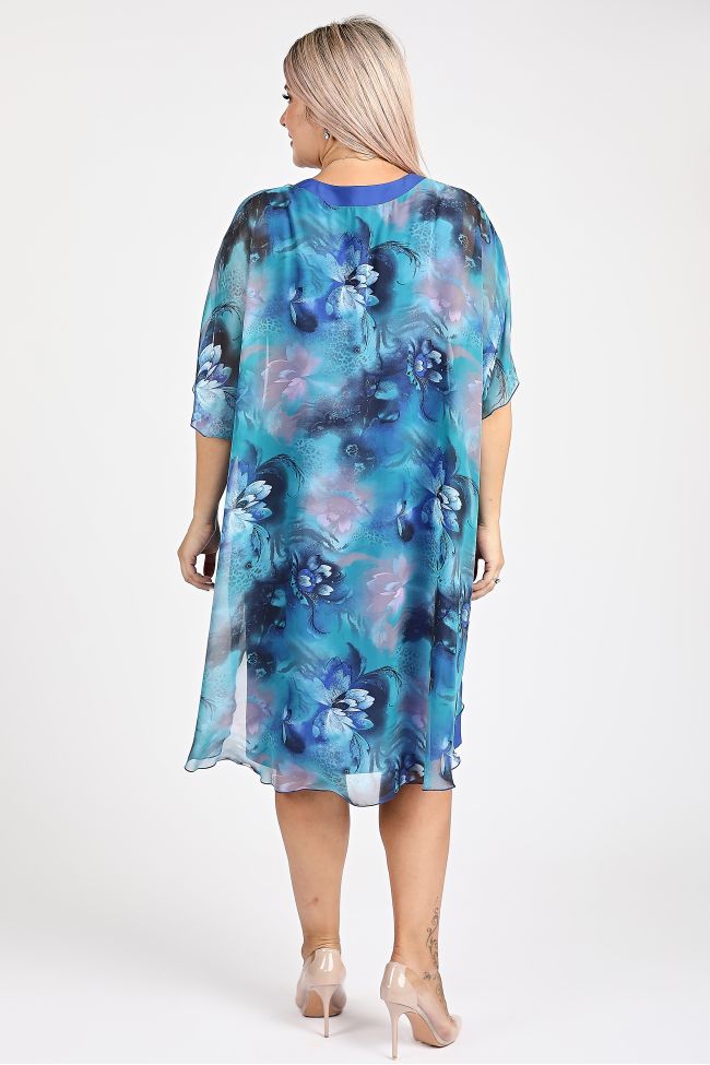 сине-зеленый Оригинальное платье свободного силуэта длиной около колена. Модель выполнена из двух видов материалов: нижнее платье из плательной ткани стрейч, верхняя накидка из мягкого шифона яркой расцветки. Горловина обработана внешней обтачкой из однотонной ткани. Нижнее платье-футляр полуприлегающего силуэта с открытыми проймами, обработанными окантовкой. Верхняя накидка с цельнокроенным рукавом свободного силуэта, по низу обработана изящной закруткой. Платье прекрасно скрывает небольшие несовершенства и подчеркивает достоинства фигуры.