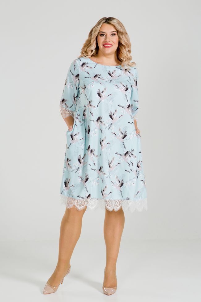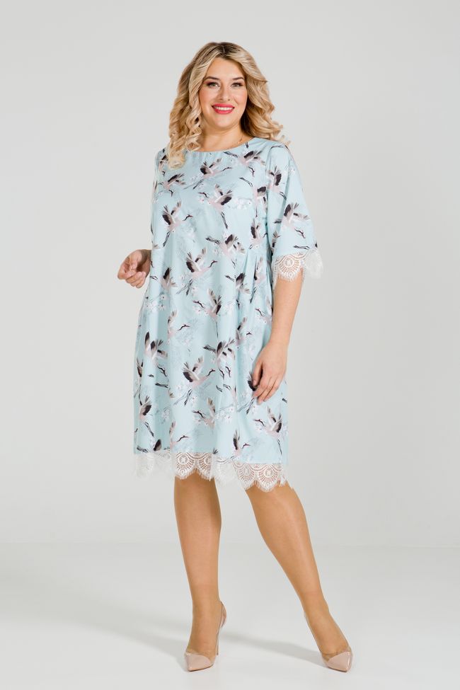 голубой Очаровательное платье свободного силуэта с модным анималистическим принтом. Круглый вырез горловины обработан внутренней обтачкой. Втачные рукава длиной 3/4. По переду подрезной бочок, в области талии заложенный "бантовыми" складками. В боковых швах карманы. Низ изделия и рукава дополнены отделкой в тон из тончайшего кружева. Модель прекрасно подойдет обладательницам любых форм и сделает выход в свет женственным и романтичным.