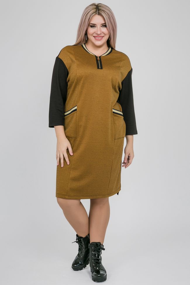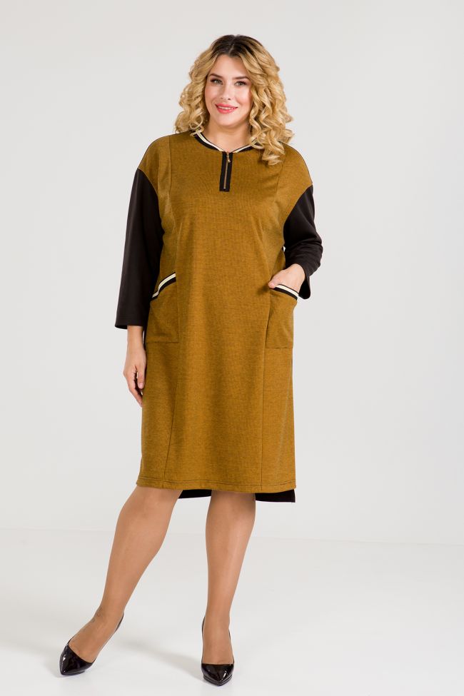 горчичный Комбинированное платье прямого силуэта из плотного трикотажного полотна  с принтом  и джерси однотон. По переду прилегание за счет вертикальных рельефов. Круглый вырез горловины с центральной застежкой на тесьму-молнию. В виде отделки по  горловине и накладным карманам - подвязы. Линия плеча приспущеная, рукава длиной 7/8 . Спинка разрезная. Низ разноуровневый, обработан на спецмашине.