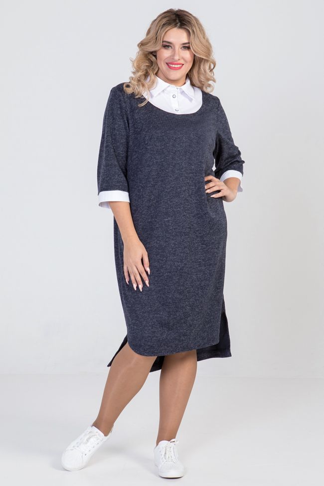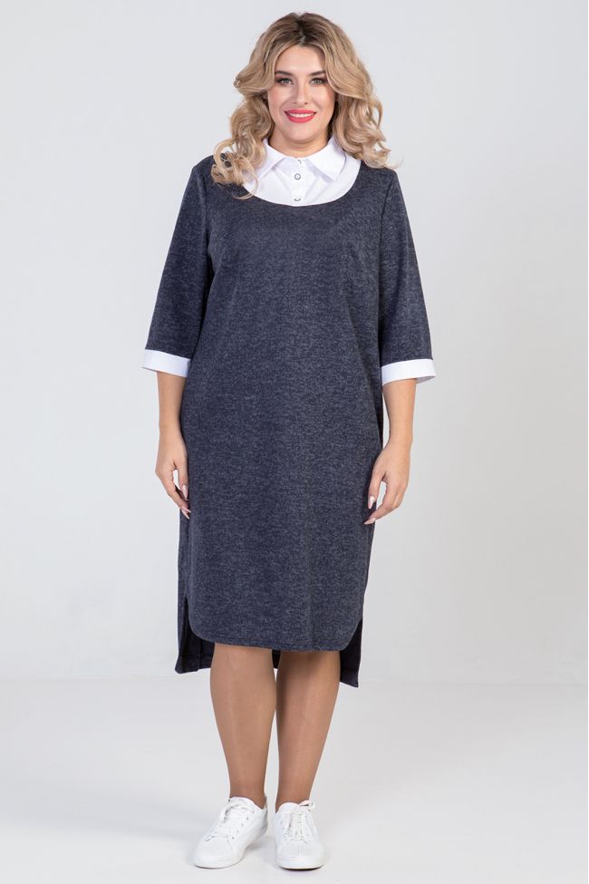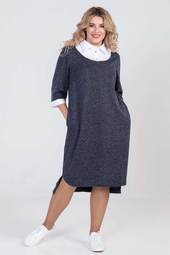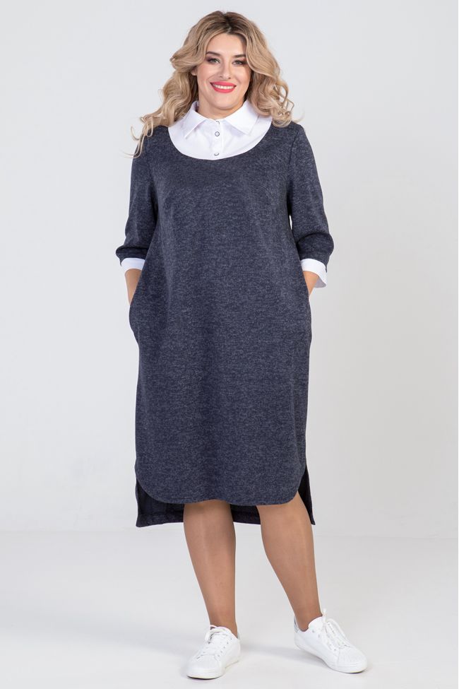 темно-синий Комбинированное платье прямого силуэта из  трикотажа ангора и отделочной ткани. По переду и спинке фигурная кокетка из отделочной ткани, с отстрочкой по шву притачивания. Горловина оформлена рубашечным воротником с планкой на петли и пуговицы. Прилегание по груди за счет вытачек. В боковых швах удобные карманы. Втачные  рукава,длиной 3/4, с притачным манжетом из отделочной ткани. Спинка разрезная. Низ разноуровневый - фигурный по переду, по спинке прямой.