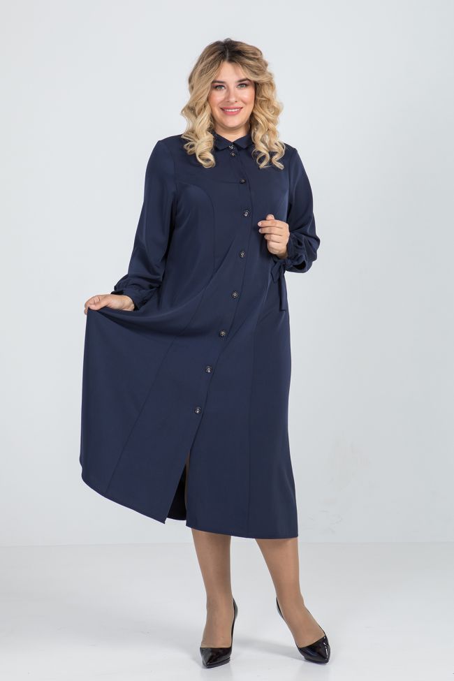 темно-синий Платье свободного силуэта из костюмно-плательной ткани. По спинке и переду вертикальные рельефы. Горловина оформлена отложным воротником на притачной стойке. По переду планка по всей длине изделия, с застежкой на петли и пуговицы.  Втачной рукав по низу  присборен и дополнен манжетой переходящей в завязки. Низ прямой. В боковых швах удобные карманы. Пояс в комплект не входит.