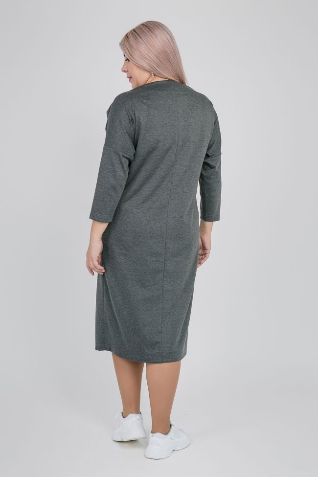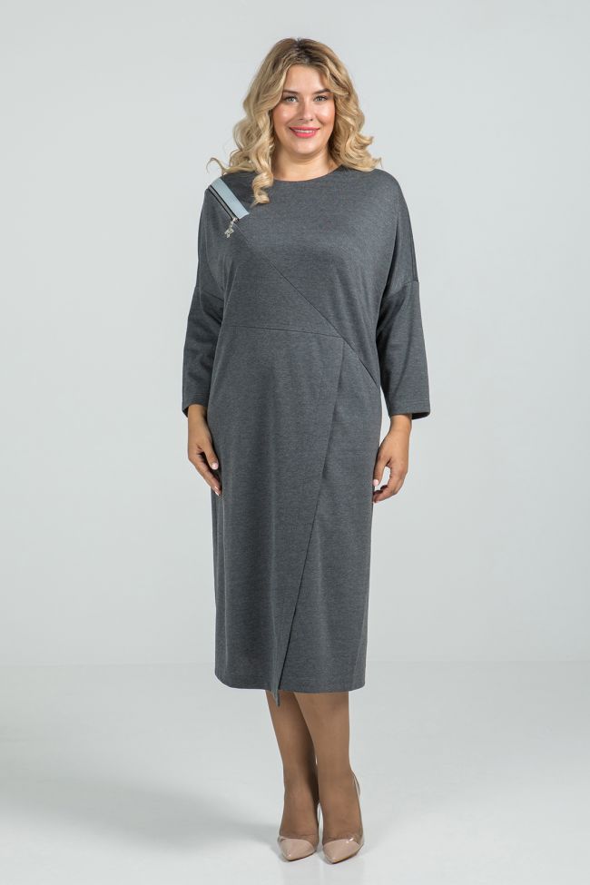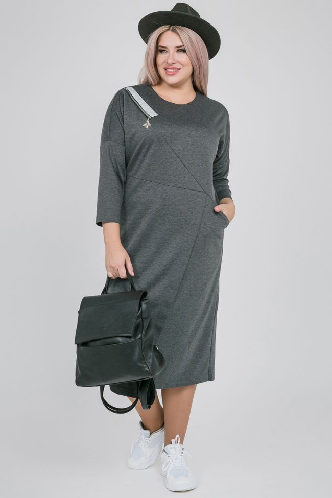 серый Платье свободного силуэта из  трикотажного полотна. Круглый вырез горловины обработан внутренней обтачкой.  Линия плеча приспущеная, рукава длиной 7\8. Перед с диагональными подрезами, справа в подрезе декоративная молния, слева внутренний карман в области бедра. На нижней части переда декоративная планка образующая  угол по низу. Спинка со средним швом.