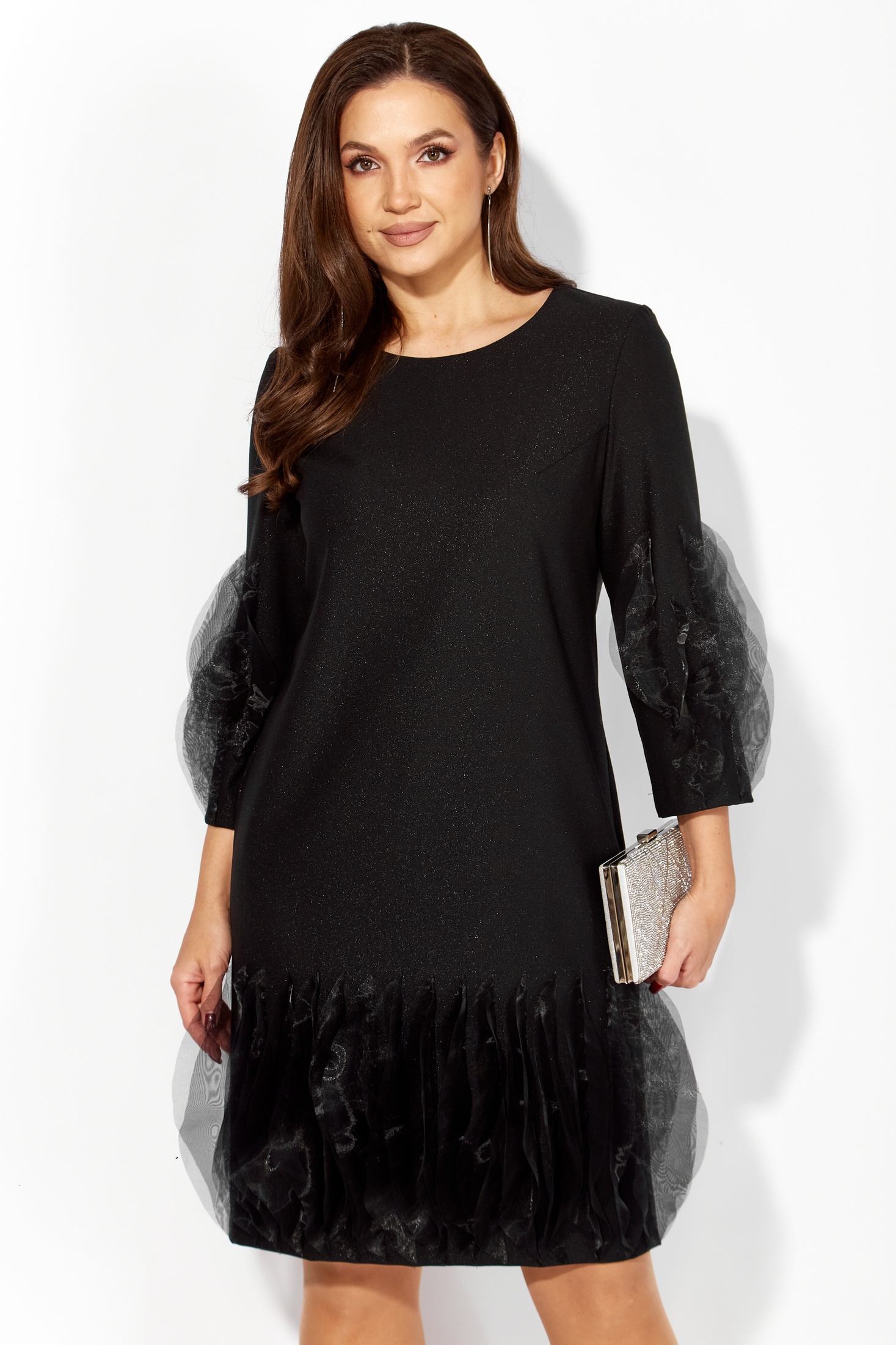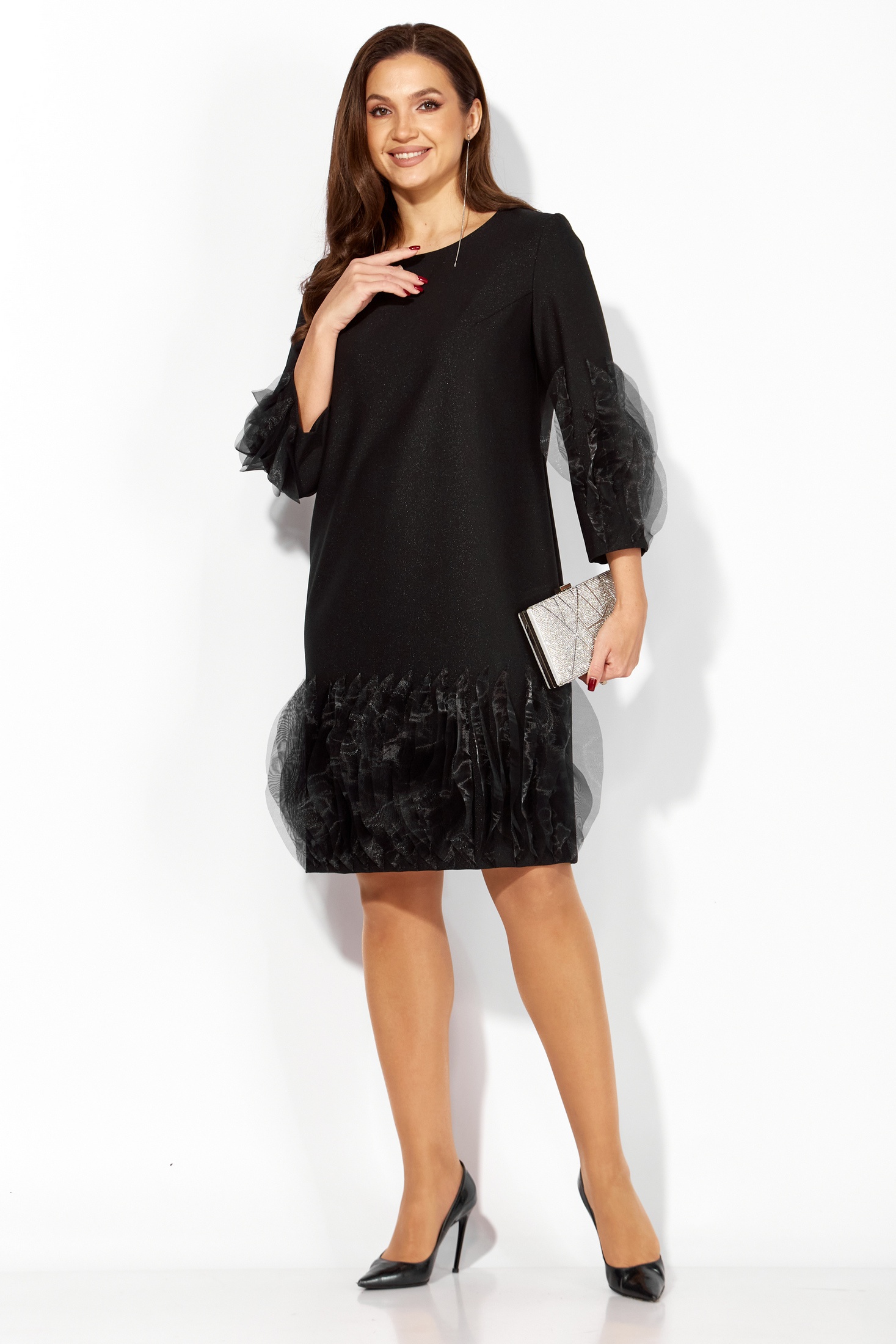 Элегантность и удобство благодаря своей изысканной ткани из поливискозы "SHANE" со стрейчем. Коллекция бренда ТАиЕР предлагает идеальное сочетание комфорта и стиля в этом прямом силуэте. Фасон с круглым вырезом горловины и рукавами длиной 3/4 справа украшены фантазийными элементами из органзы, добавляя утонченности. Потайная молния на спинке делает платье удобным в использовании. Черный цвет придаёт платью универсальность, позволяя использовать его в любое время года, от работы в офисе до вечерних мероприятий.