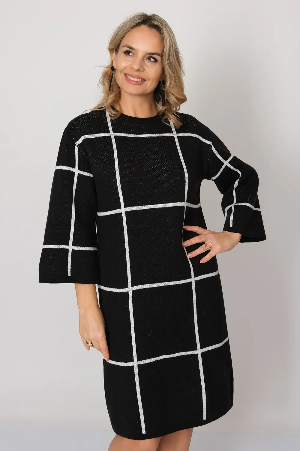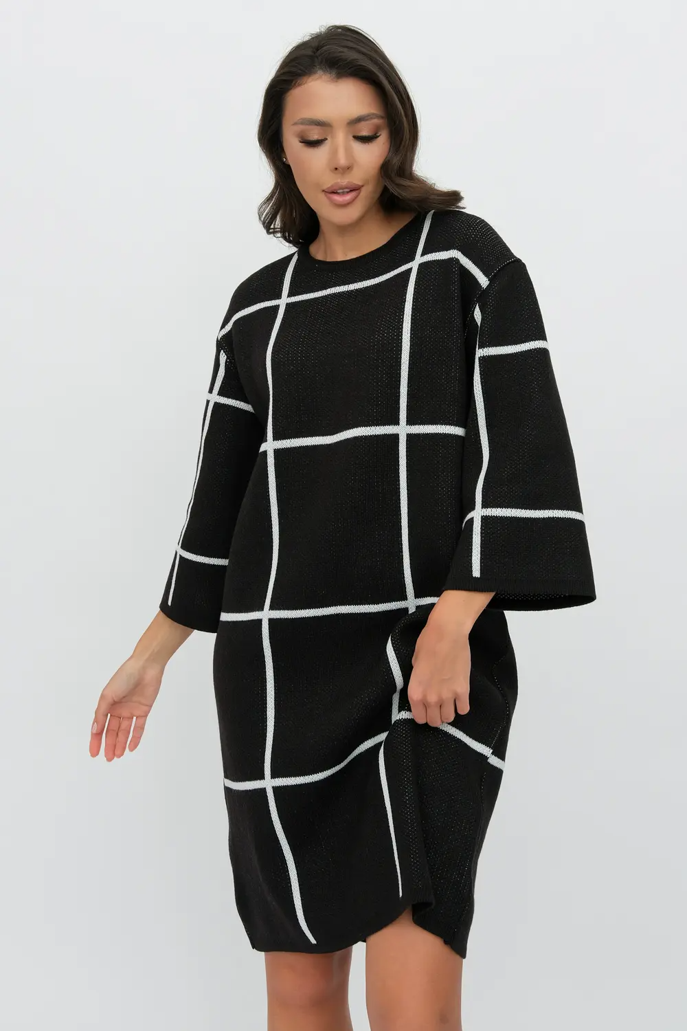 Женское трикотажное платье свободного силуэта. Вырез горловины круглый, рукава втачные длиной 7/8. Платье выполнено жаккардовым переплетением, образуя геометрический рисунок-клетка. черный