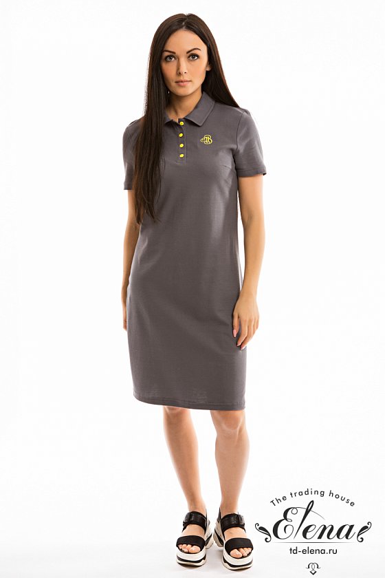 Стильное платье-поло из однотонного полотна пике. С коротким рукавом, отложным воротником и планкой с застёжкой на пуговицы. С левой стороны украшает изделие небольшая вышивка. По низу боковых швов разрезы.