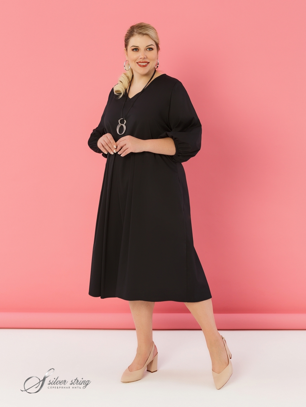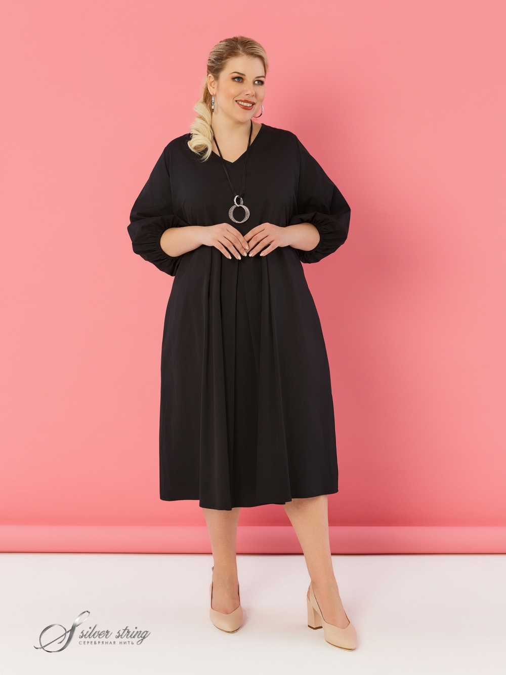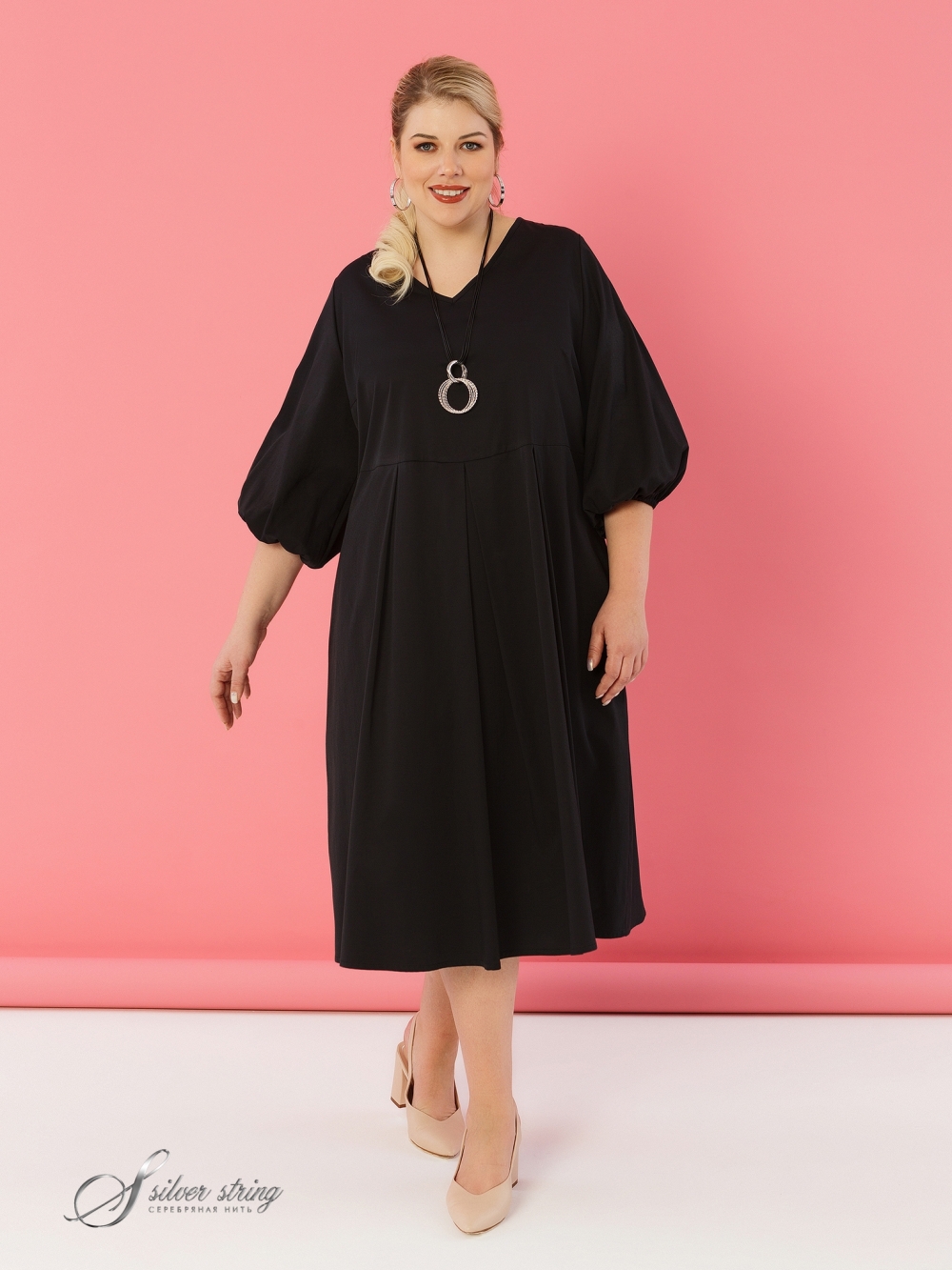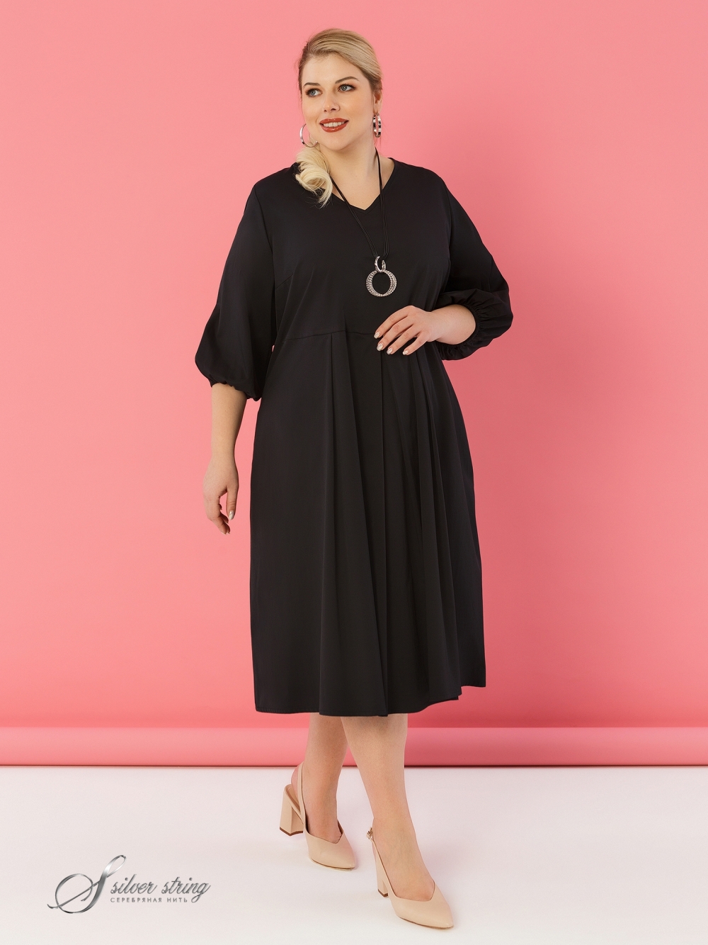 Изящное платье, отрезное по линии талии, идеально подходит для создания элегантного образа. Выполненное из эластичной ткани с высоким содержанием хлопка, оно обеспечивает комфорт и свободу движений. Длина платья до середины икры. Глубокие мягкие складки от линии талии создают женственный и легкий силуэт. V-образный вырез гармонично подчеркивает линию шеи, а отсутствие застежки обеспечивает легкость надевания. Объемные рукава длиной 3/4 с резинкой по низу добавляют изделию стиль и удобство.