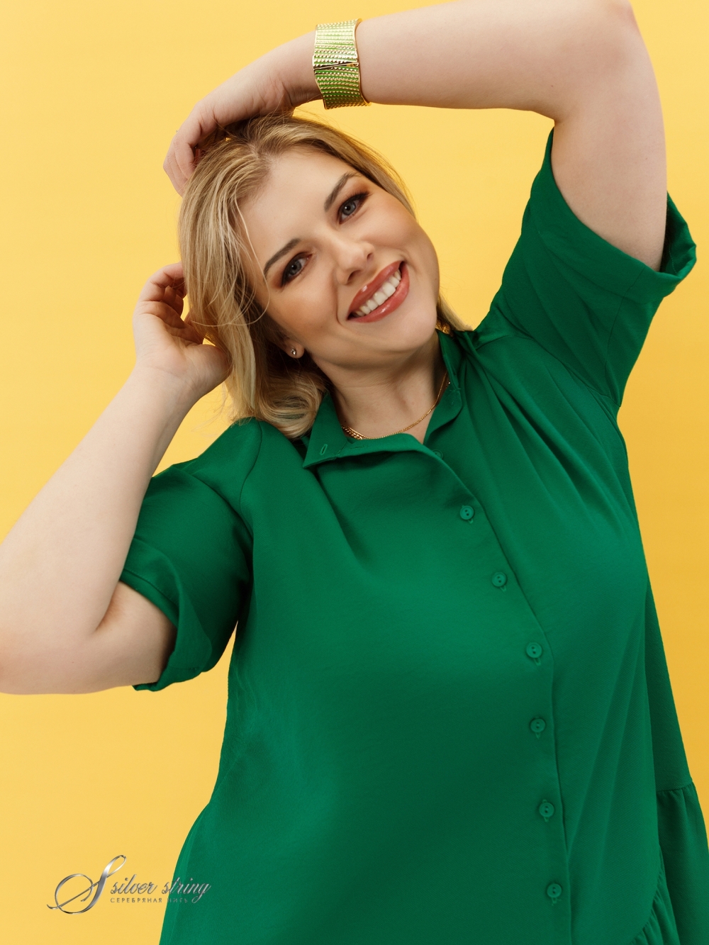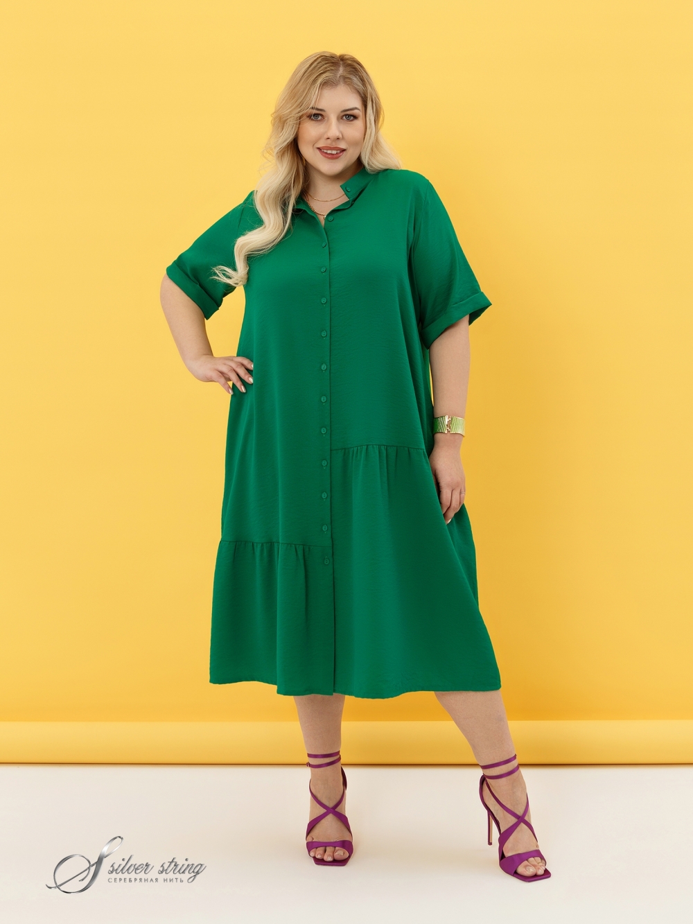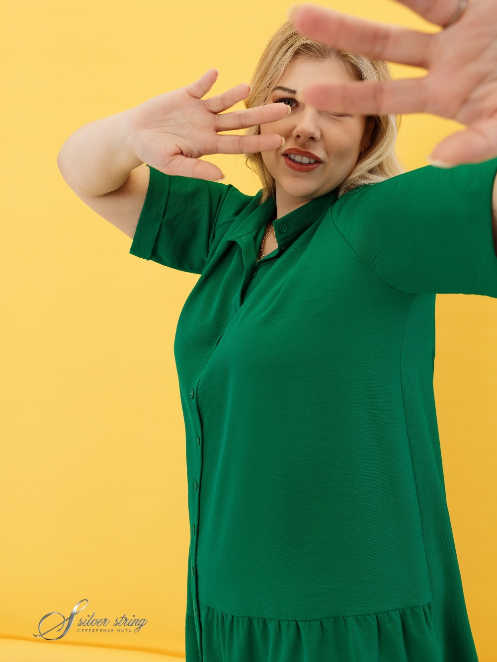 Эффектное платье прямого силуэта, длиной до середины икры, выполнено из яркой смесовой ткани «крэш» - эффектом. Модель распашная, с застежкой на пуговицы. Воротник-стойка. По полочке обработаны горизонтальные подрезы, от которых заложена легкая сборка, подрезы расположены на разном уровне, что придает изделию особый шарм. Рукав втачной, длиной до локтя. Низ рукава оформлен отворотом. Нежный женственный стиль сегодня в тренде. А это значит, что оборки и воланы правят бал. Наше платье цвета сочной зелени наверняка поднимет Вам настроение.