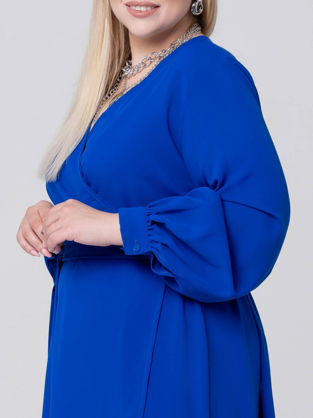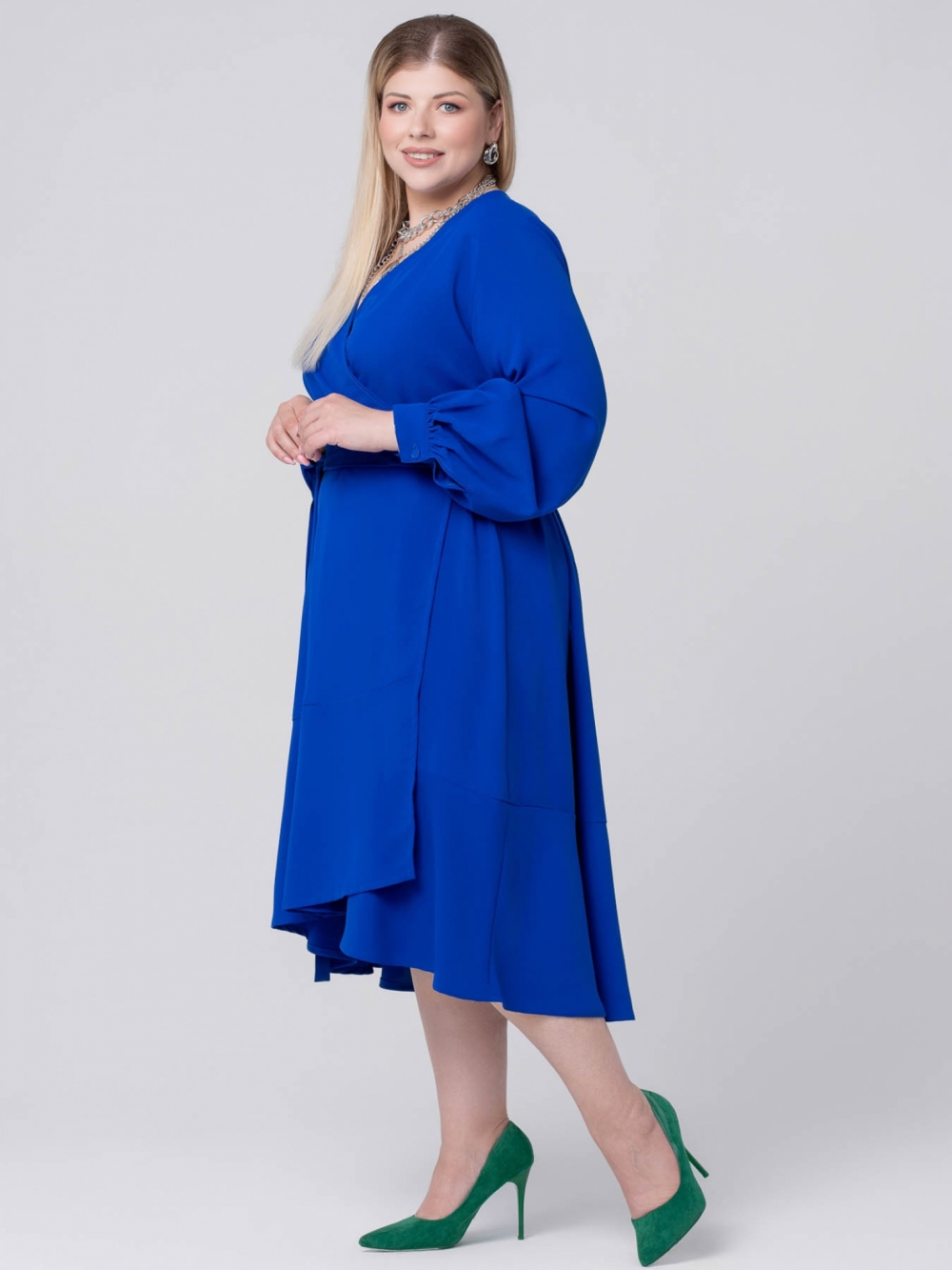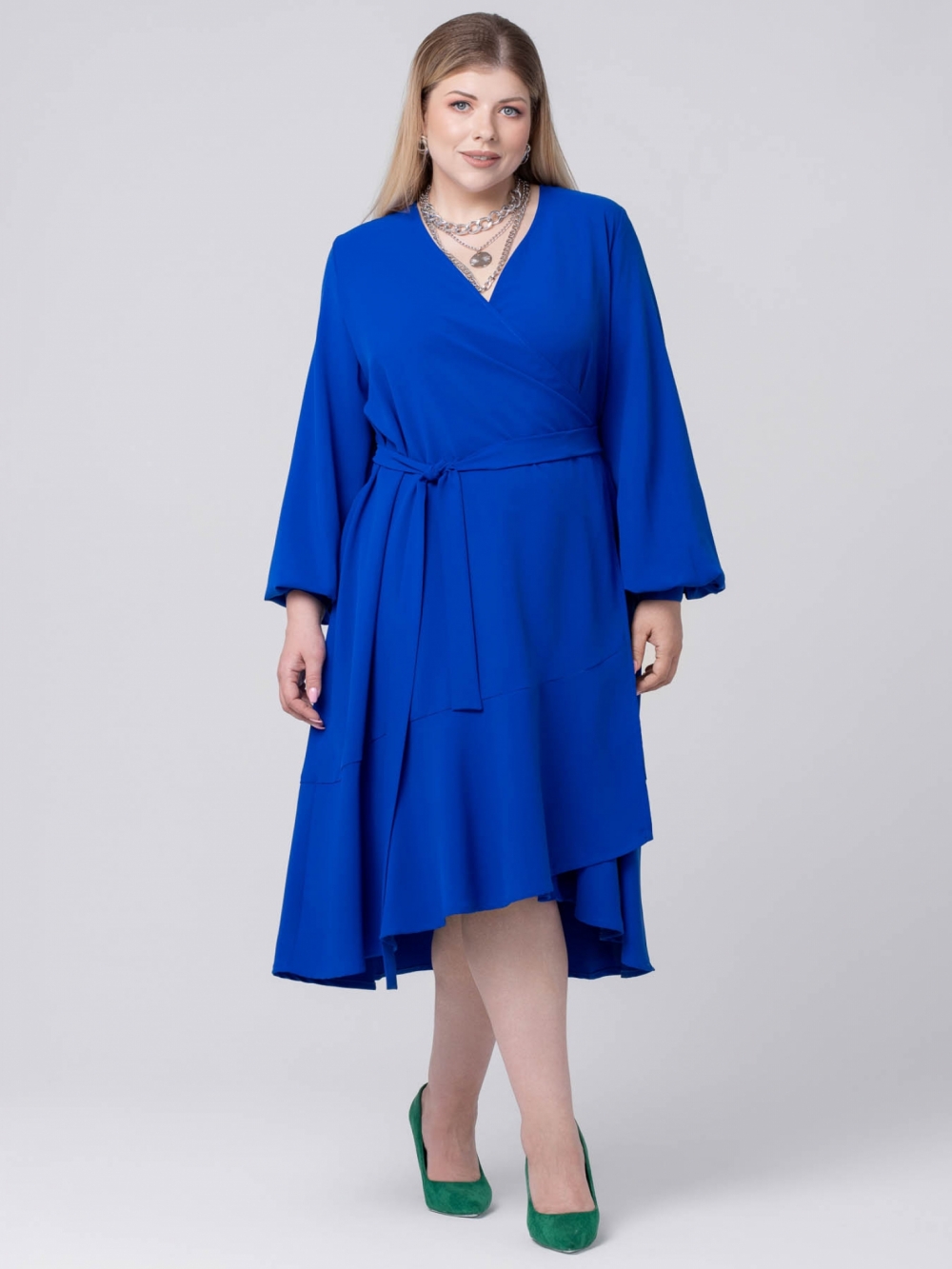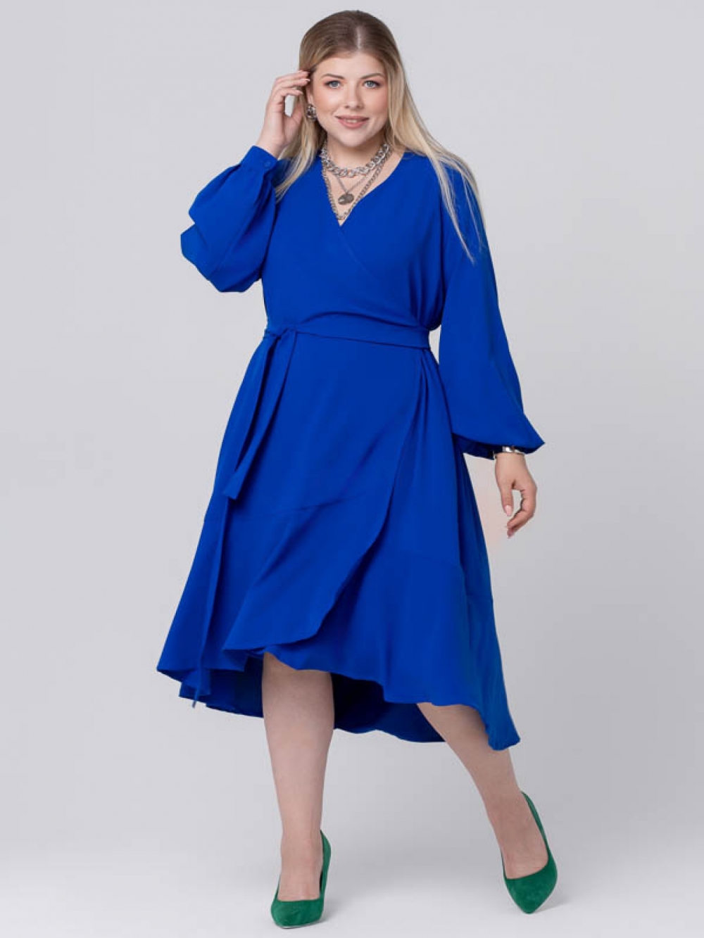 Эффектное платье А-образного силуэта выполнено из яркой смесовой ткани с эластаном. Модель длиной «миди», с V-образным вырезом горловины, переходящим в «запах». На уровне талии закреплены части широкого пояса, которым фиксируется изделие на фигуре. Платье с объемным длинным рукавом. Низ рукава присобран на притачную манжету. Обхват манжеты можно регулировать за счет застежки на парные пуговицы. Нижняя часть платья асимметрично оформлена, спинка плавно удлинена относительно полочки, и, обработана притачным воланом. Удивительный цвет модели обладает мощным энергетическим воздействием. Он выражает сильные эмоции и привлекает внимание. Этот цвет заряжает бодростью, энергией и оптимизмом. Особенно в зимний период, когда всем не хватает красок.