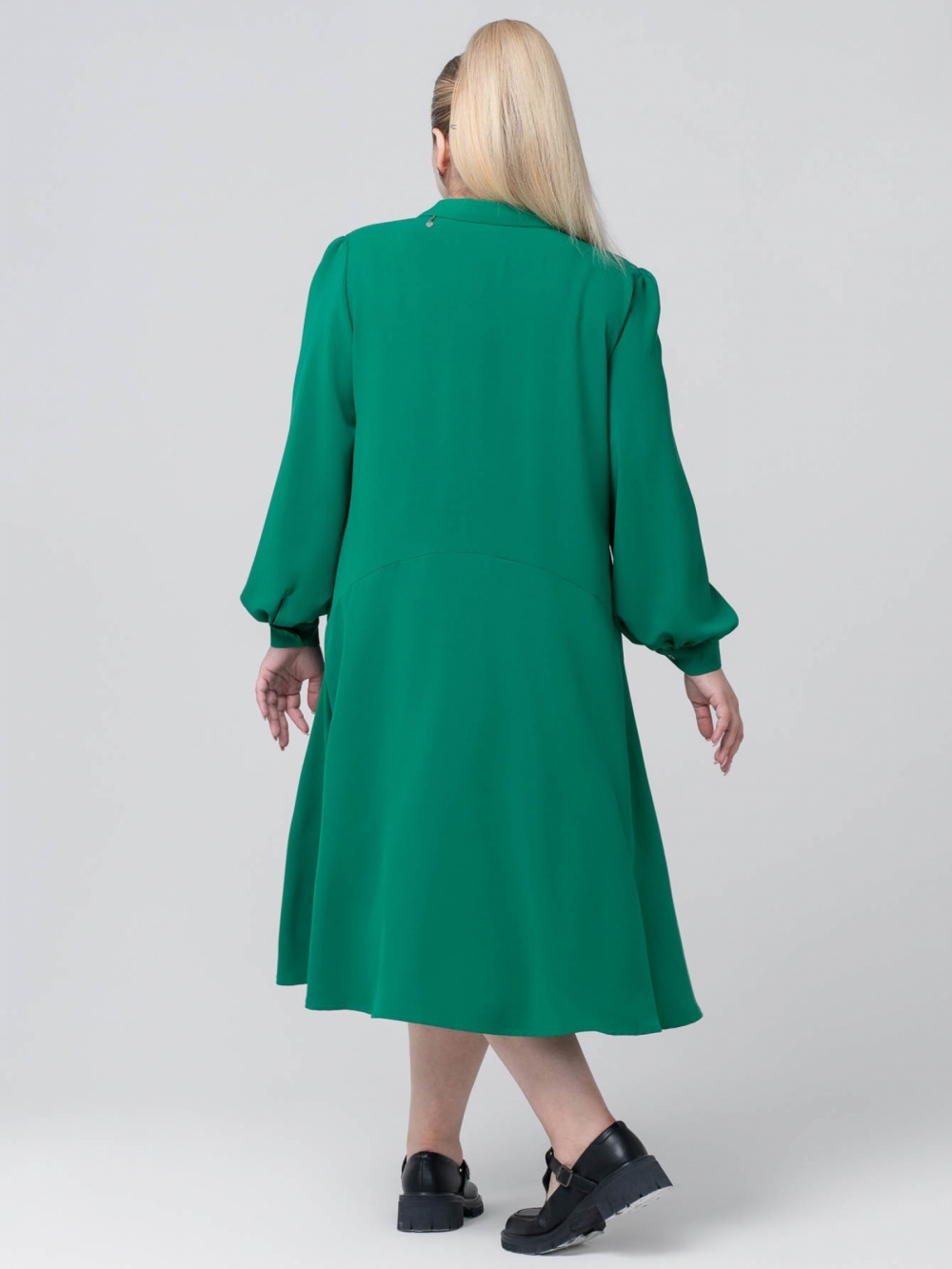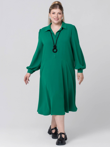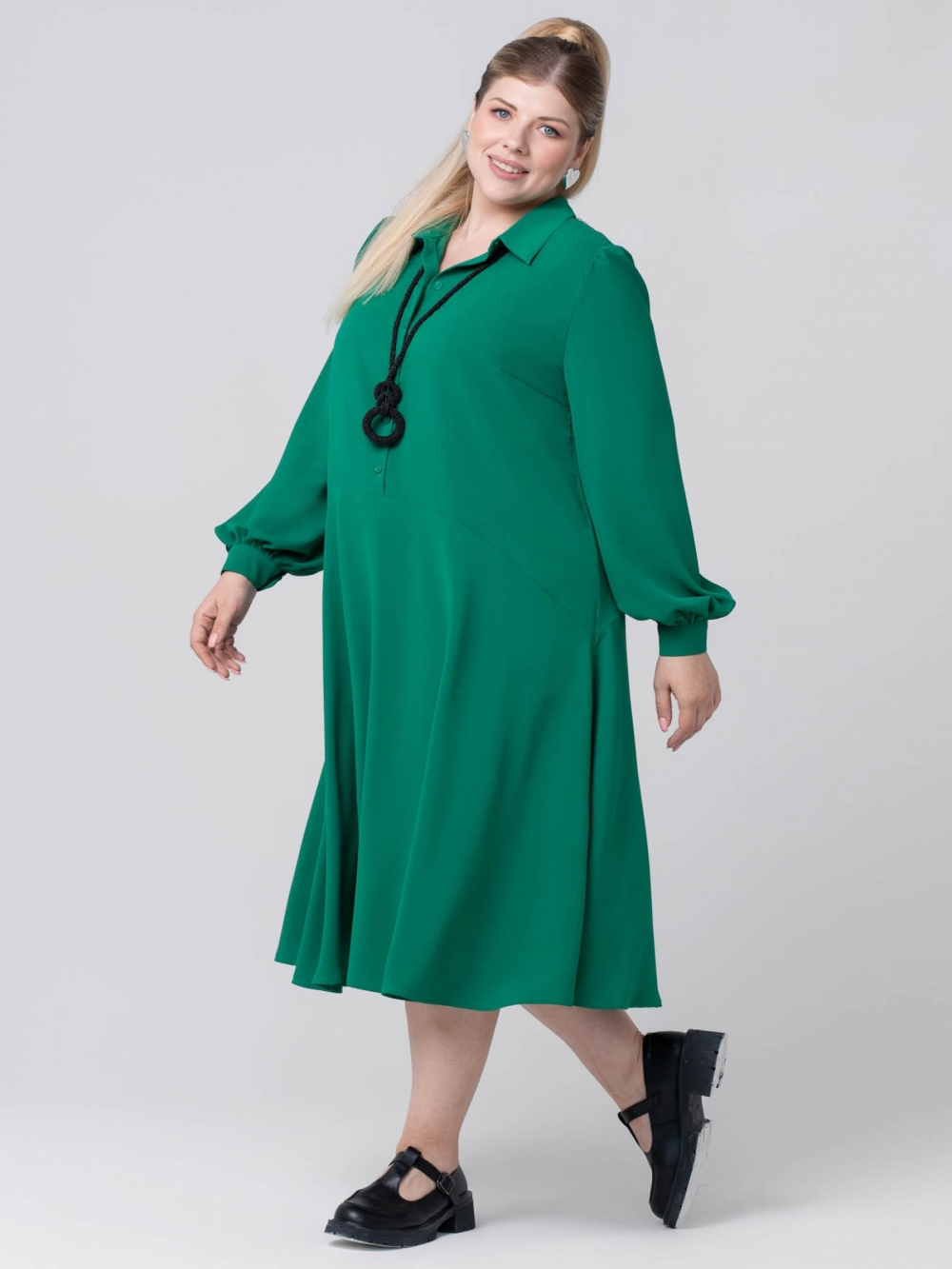 Стильное платье из яркой смесовой ткани - идеальный выбор для тех, кто ценит комфорт и элегантность. Его длина «миди» и А-образный силуэт создают утонченный и женственный образ. Модель с рубашечным воротником на стойке и длинным втачным рукавом. Низ объемного рукава присобран на притачную манжету. Обхват манжеты можно регулировать за счет парных пуговиц. На полочке и спинке расположены скругленные подрезы, которые плавно спускаются к боковым швам. Застежка на пуговицы в цвет ткани достигает линии подреза. Яркий цвет изделия прекрасно выполняет anti-age –функцию, поможет выглядеть современно, динамично и стильно.