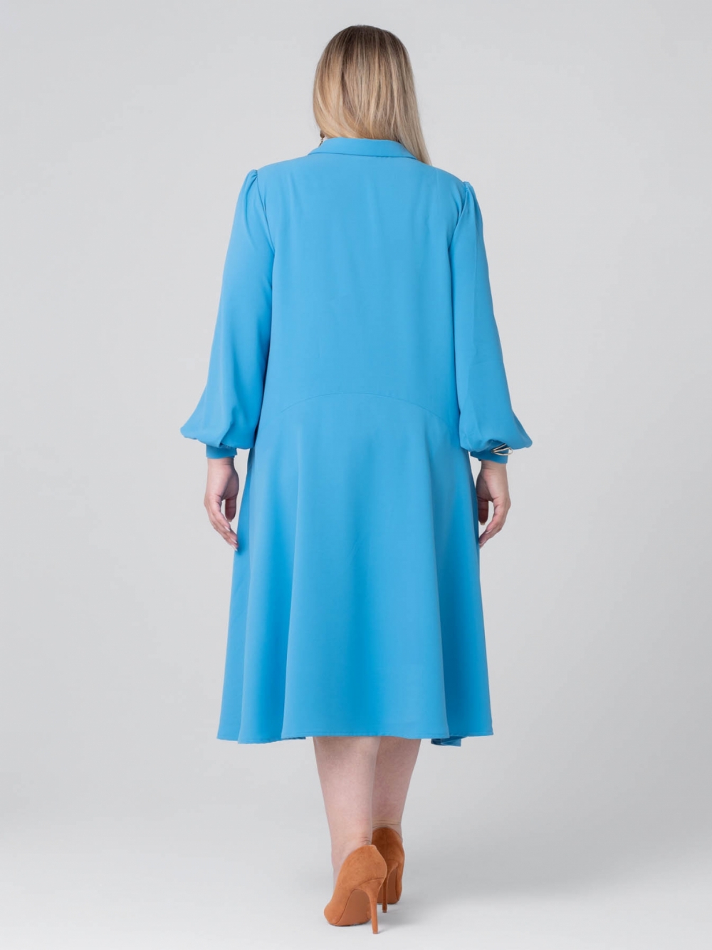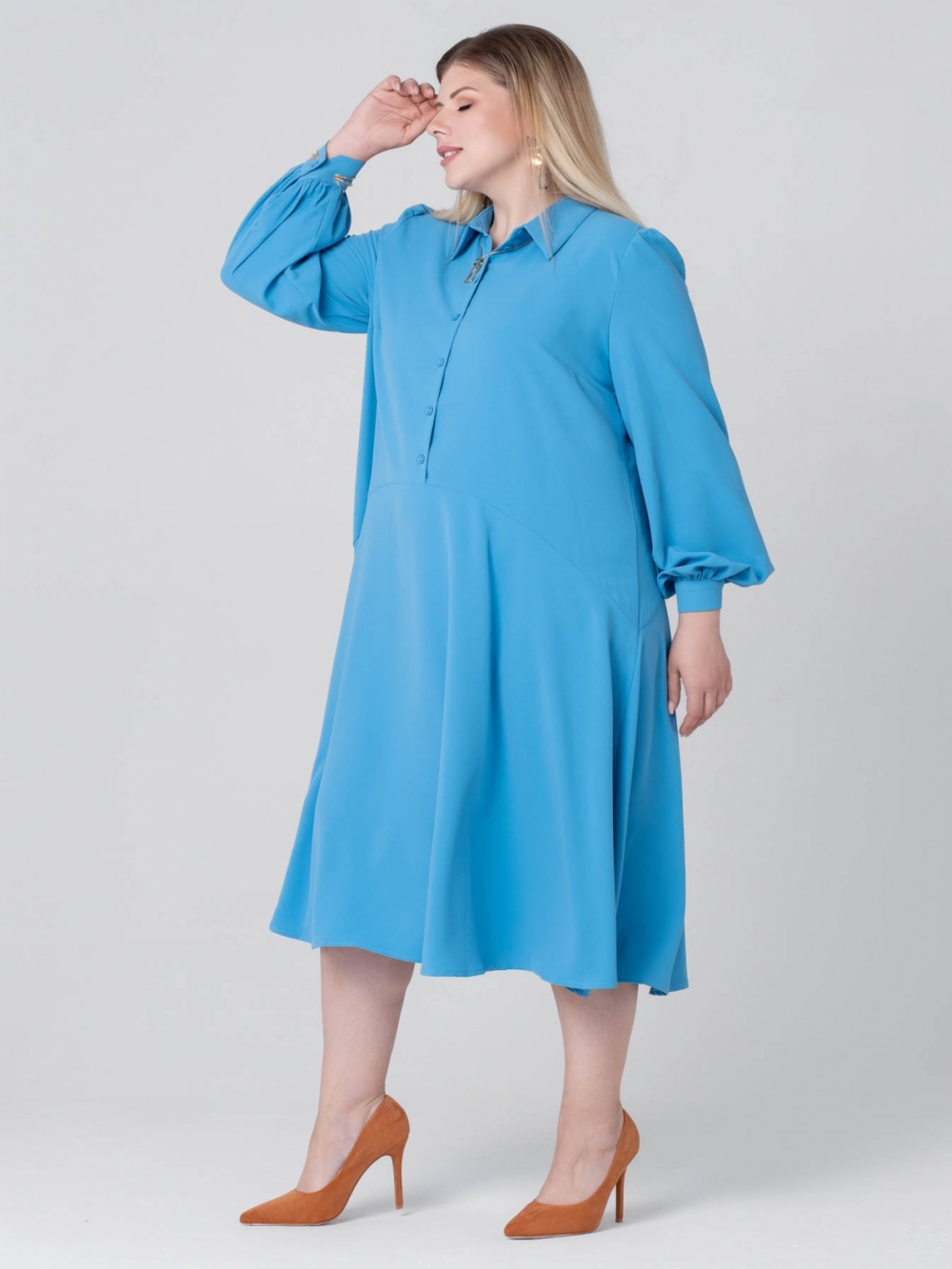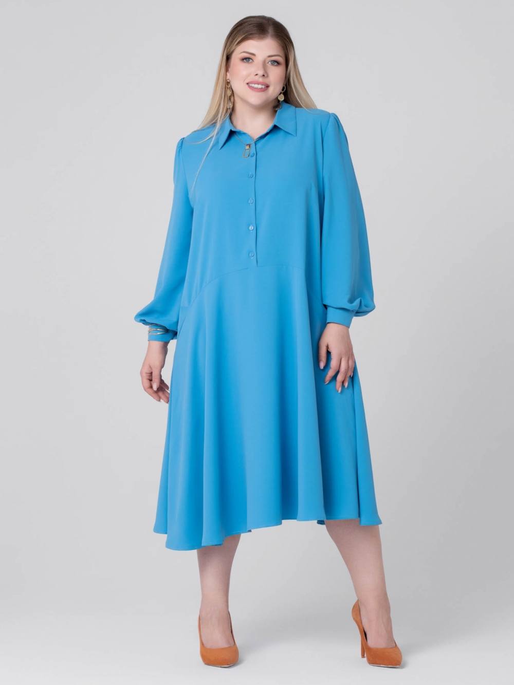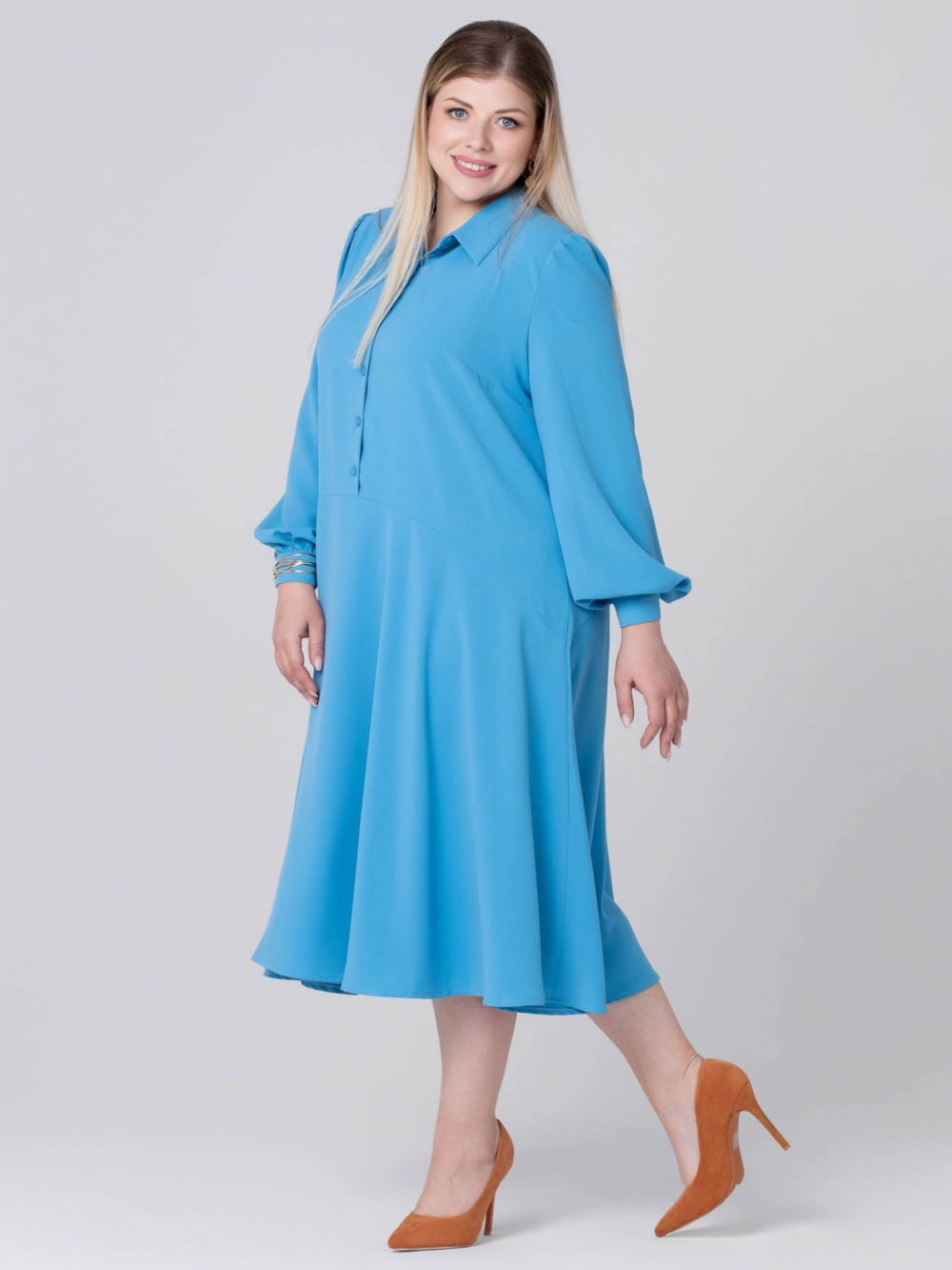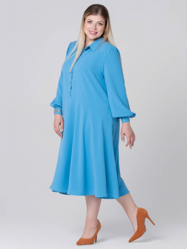 Стильное платье из яркой смесовой ткани - идеальный выбор для тех, кто ценит комфорт и элегантность. Его длина «миди» и А-образный силуэт создают утонченный и женственный образ. Модель с рубашечным воротником на стойке и длинным втачным рукавом. Низ объемного рукава присобран на притачную манжету. Обхват манжеты можно регулировать за счет парных пуговиц. На полочке и спинке расположены скругленные подрезы, которые плавно спускаются к боковым швам. Застежка на пуговицы в цвет ткани достигает линии подреза. Яркий цвет изделия прекрасно выполняет anti-age –функцию, поможет выглядеть современно, динамично и стильно.