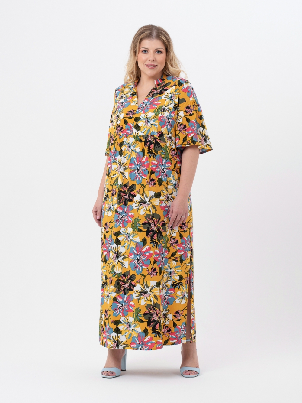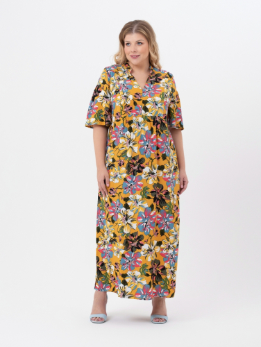 Эффектное платье прямого силуэта выполнено из натуральной ткани с ярким цветочным рисунком. Модель длиной maxi, с подрезной, прямоугольной кокеткой по груди. К низу от кокетки заложена легкая сборка. Вырез горловины у-образной формы оформлен стойкой. Рукав втачной, длиной за локоть, с подрезом по верху оката. По линии подреза рукав слегка присборен. В боковых швах обработаны разрезы. Женственный стиль сегодня необыкновенно актуален, а это значит, что наше платье сочной расцветки придется, как нельзя кстати, для летнего гардероба.