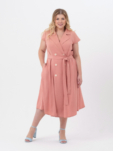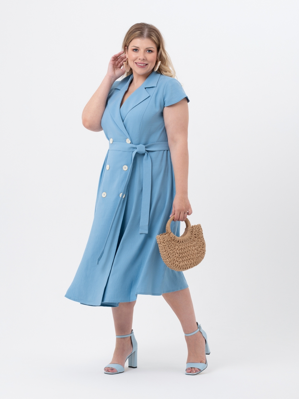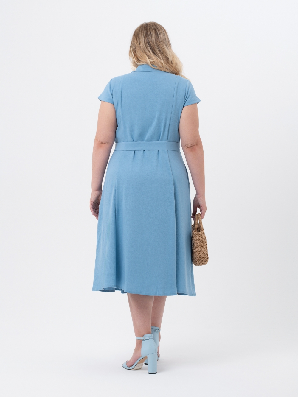 Стильное платье, клешеное к низу, из однотонной «крэшированной» вискозной ткани с добавлением эластана. Модель длиной «миди», с английским воротником на углубленной горловине и двубортной застежкой на пуговицы контрастного цвета. Рукав короткий, типа – «крылышко». В боковых швах расположены удобные карманы. Модель комплектуется съемным поясом. Цвет незабудки, в котором выполнено платье, стал крайне популярным у модниц. Он спокойнее и светлее лазури, смотрится легко и свежо. Особенно к лицу сероглазым и голубоглазым женщинам и девушкам.