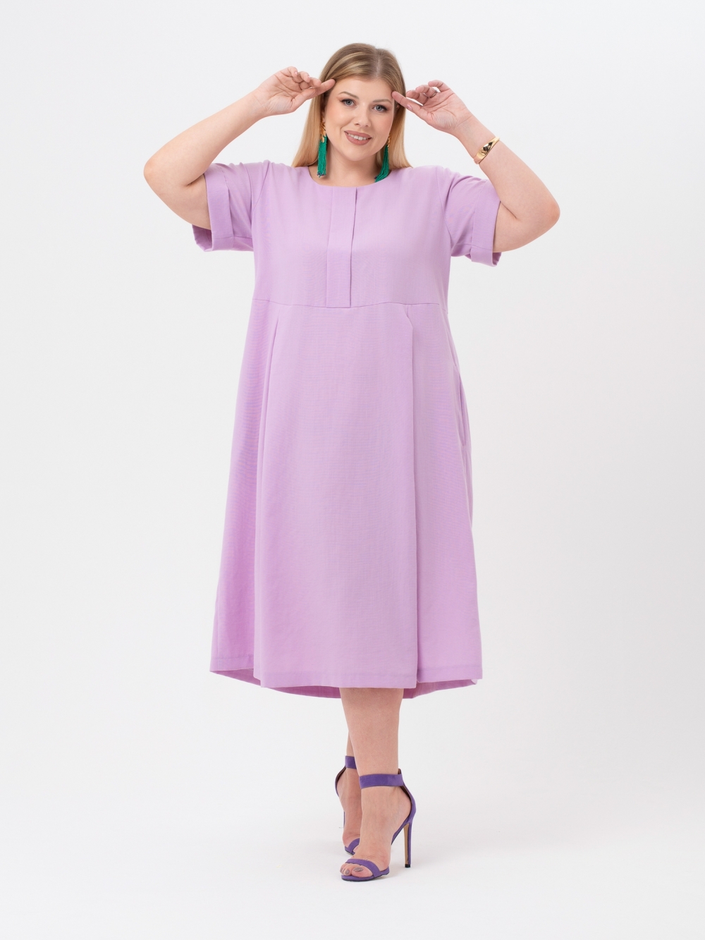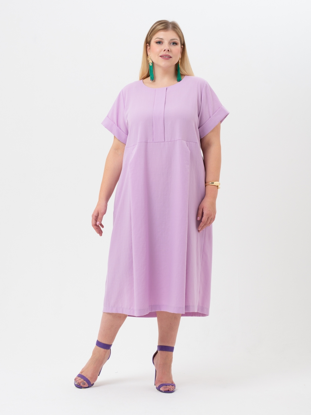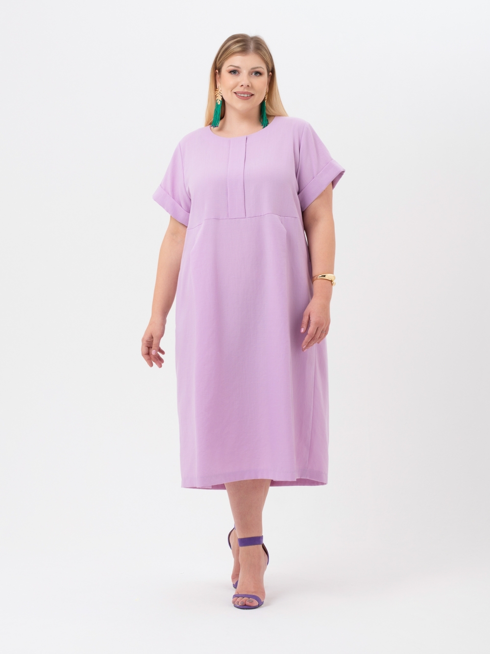 Стильное платье прямого силуэта выполнено из смесовой ткани с высоким содержанием натурального волокна пастельного оттенка. Модель длиной до середины икры. На полочке и спинке расположены горизонтальные подрезы. По центру лифа полочки застрочена бантовая складка, а по низу полочки и спинки заложены парные встречные складки, которые зрительно вытягивают фигуру. Рукав втачной, длиной до локтя, с отворотом по низу. Горловина округлой формы. Это платье - отличный выбор для тех, кто ценит комфорт и хочет выглядеть модно.