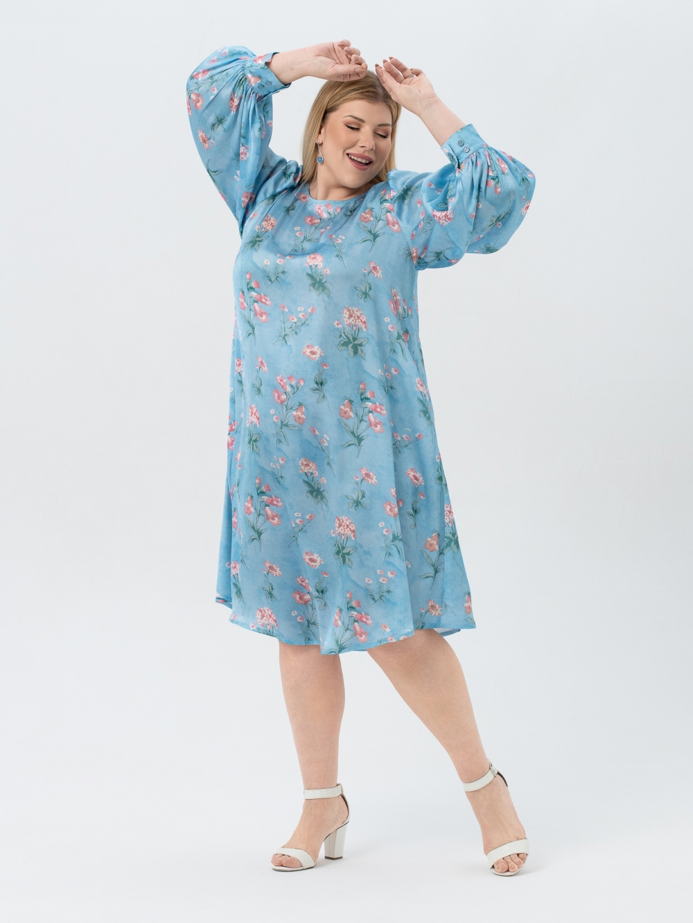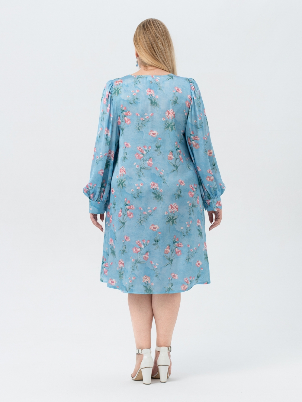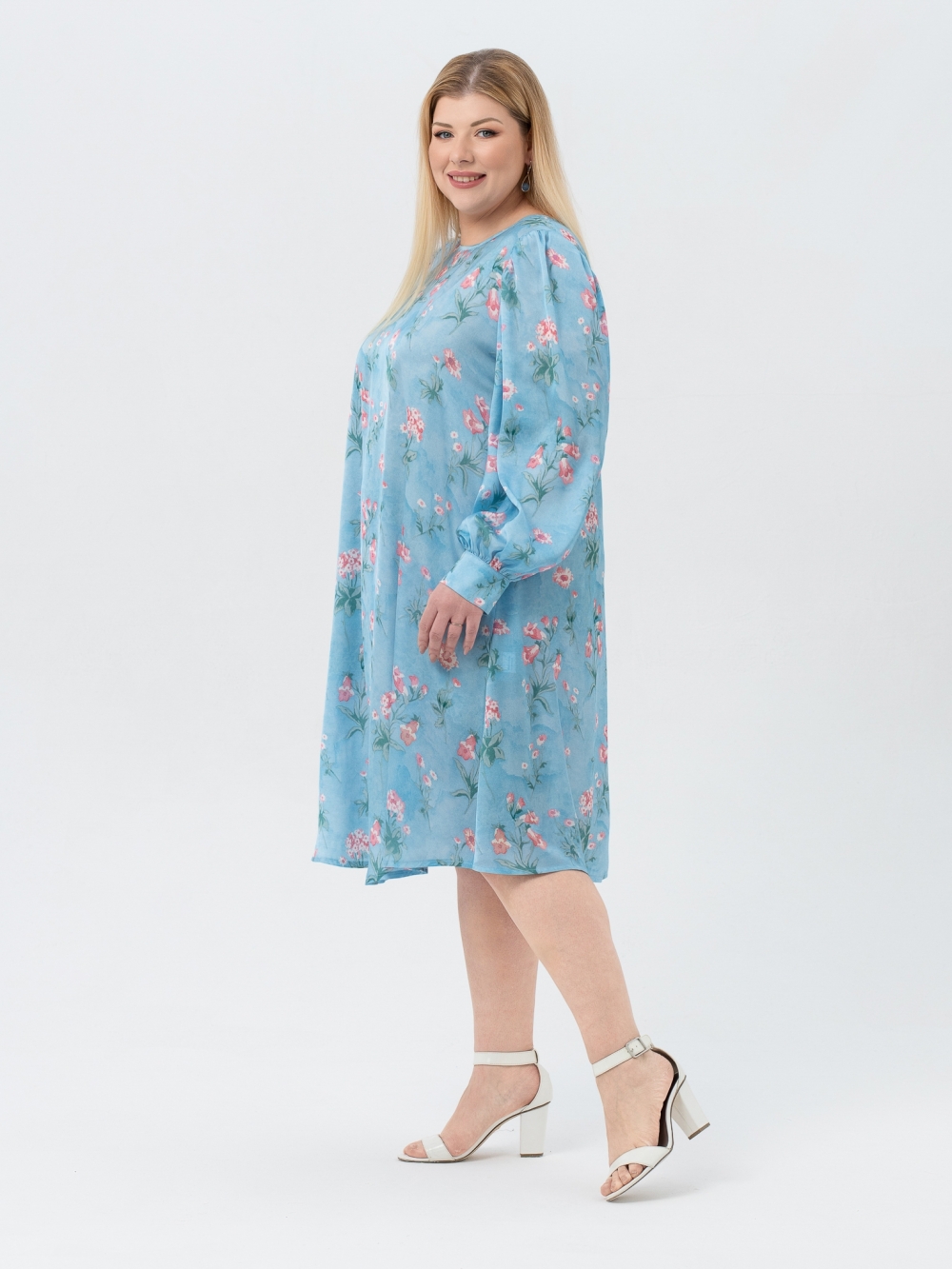 Шикарное платье А-образного силуэта, длиной до середины икры из шелковистой смесовой ткани с цветочным рисунком, выполненным в технике digital. Горловина округлой формы. Длинный втачной рукав имеет объемную форму за счет сборки, заложенной по окату. Низ рукава присобран на притачную манжету. Объем манжеты можно регулировать за счет парных пуговиц. В боковых швах обработаны удобные карманы. Модели женственного сегодня стиля особенно актуальны. Поэтому наше платье может занять главное место в Вашем гардеробе, ведь его фасон прекрасно скроет возможные недостатки фигуры и поможет выглядеть всегда великолепно.
