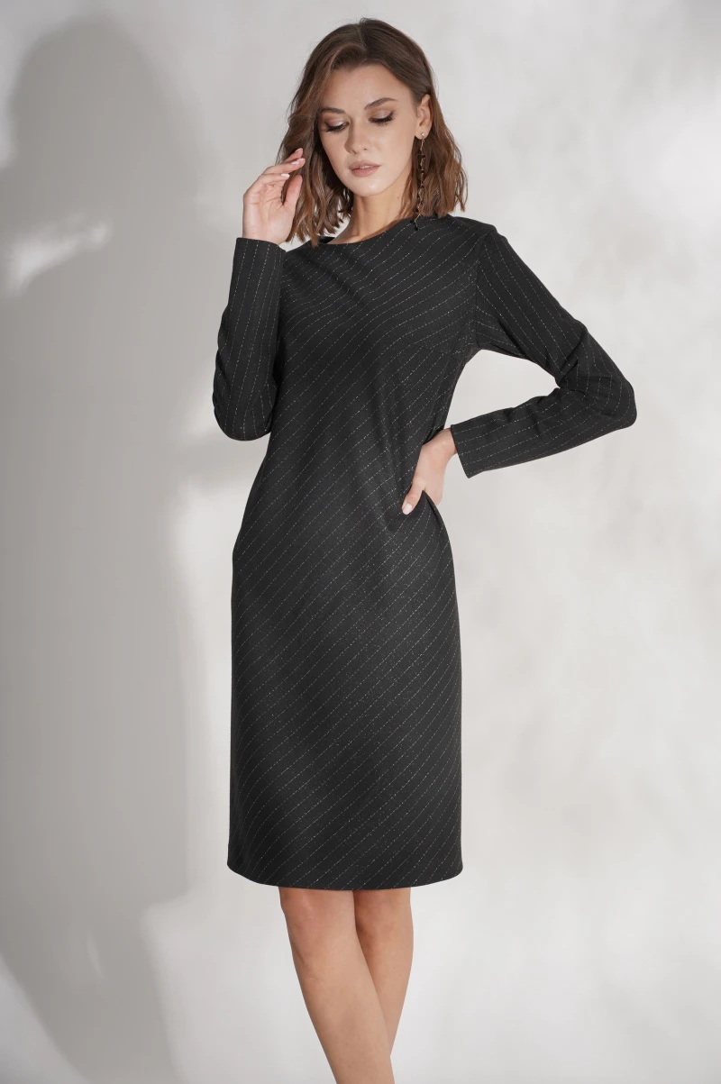 Платье классической длины миди - это отличное решение для наряда на вечер, когда хочется заинтриговать окружающих. Ведь в таком случае лучшее это закрытость… Трикотажное поливискозное полотно в многоцветную люрексовую полоску в сочетании со строгим черным цветом придает интригу данной модели. Платье полуприлегающего силуэта с вырезом лодочка горловины, сложным покроем с заниженной линией плеча и узким длинным рукавом. Спинка с центральным швом со скрытой застежкой на тесьму-молнию, талиевыми вытачками и разрезом. Длина платья около 100 см. Длина рукава с плечом около 72 см.
