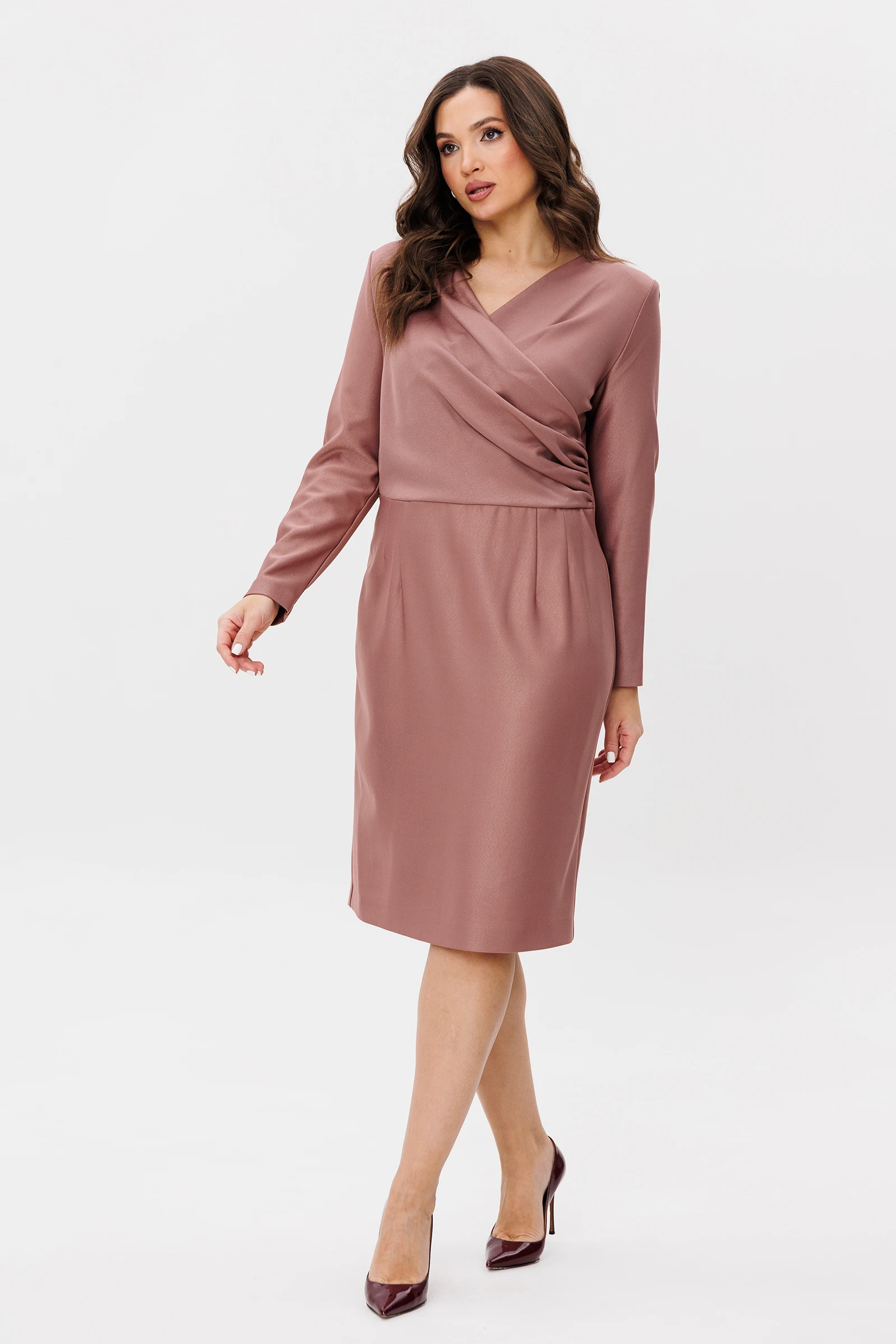 Женщина действительно чудо, которое поражает своей красотой, удивляет умением ее использовать, шокирует своими перевоплощениями. А когда она надевает платье - становится просто неотразимой. Изысканная модель с акцентом на талии. Сдержанный и очень элегантный покрой гармонично сочетается с отрезным драпированным лифом на запах. Рукав втачной, спинка с таливыми вытачками и скрытой застежкой на тесьму-молнию. Длина изделия около 100 см. Длина рукава около 60 см.