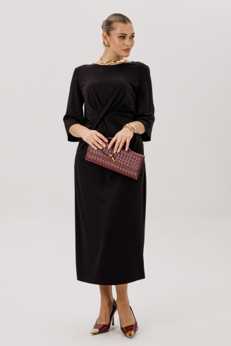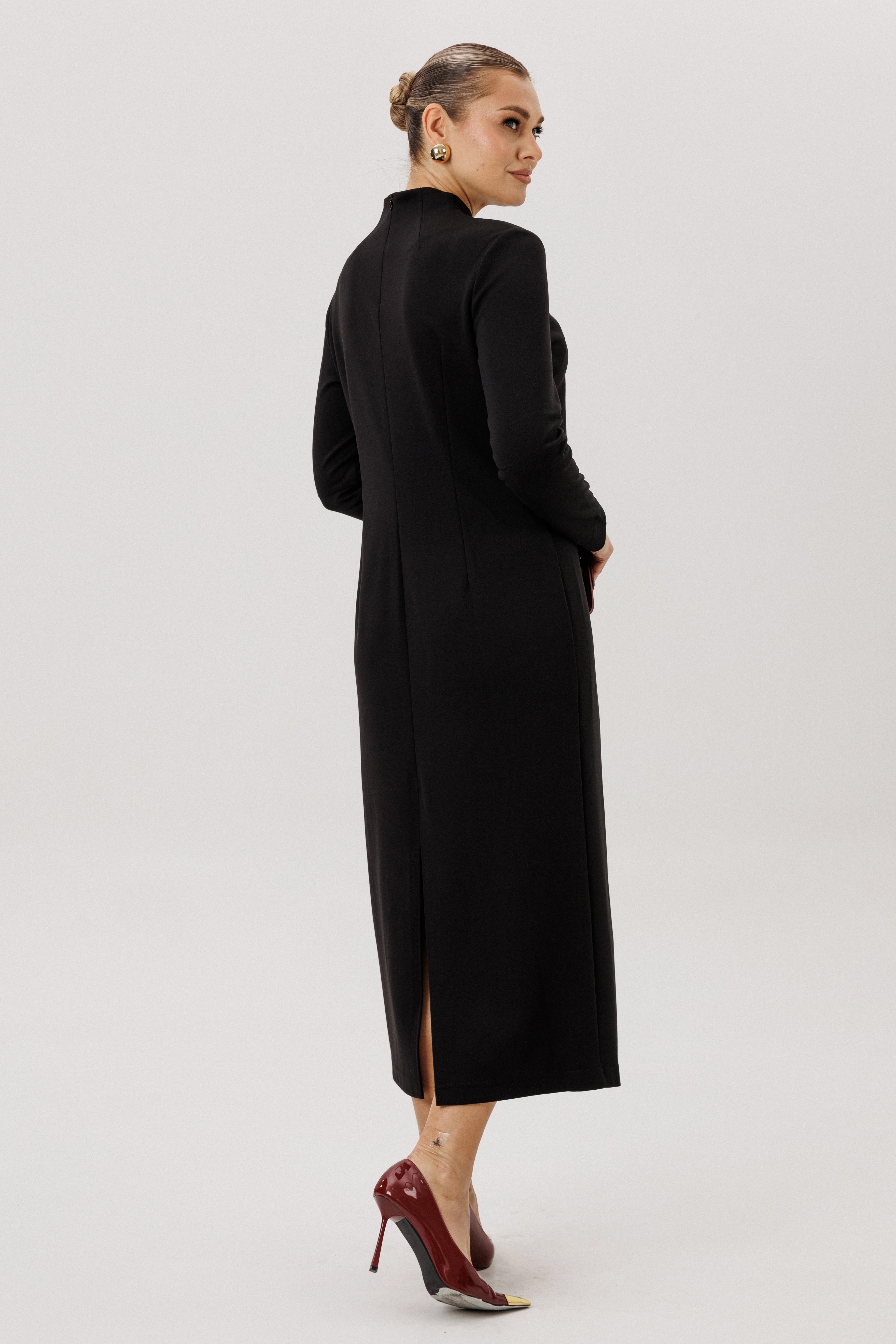 Таинственность великолепного чёрного платья не останется не замеченной. Она элегантно и лаконично, однако оригинальное исполнение выреза горловины со сложным геометрическим решением, делает образ очень эффектным. Полуприлегающий силуэт, втачной покрой. Полочка с рельефом, переходящим в вырез горловины. Спинка с центральным швом, разрезом и молнией, цельнокроённой стойкой и талиевой вытачкой.Длина платья около 132 см.Длина рукава около 60 см.