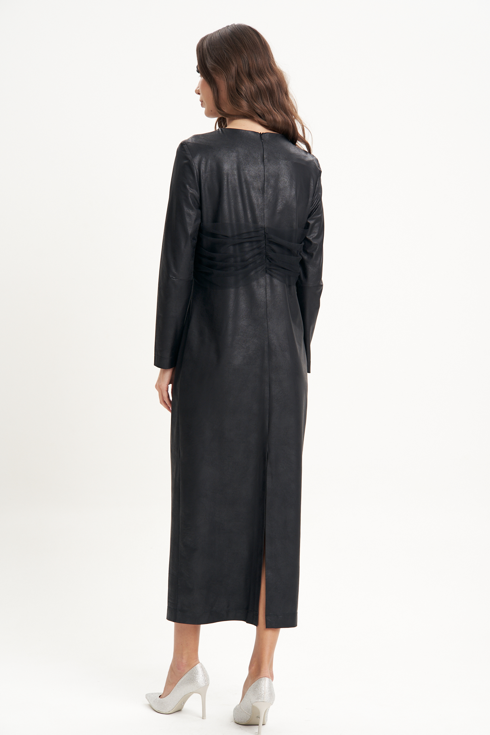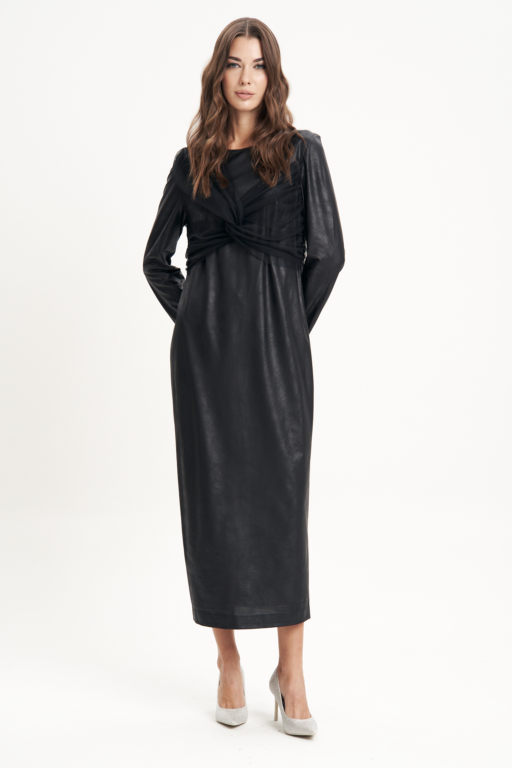 Вечно актуальное и самое эффектное! Это, конечно же, о длинном чёрном платье! Казалось бы, придумать что-то новое уже невозможно, но мы опять удивляем вас необычным сочетанием модных фактур и покроя при, казалось бы, минималистичном платье.Полуприлегающий силуэт, втачной покрой, эффектное трикотажное полотно с покрытием под кожу и потрясающе изысканный элемент из сборенной сетки по полочке и спинке. Полочка с нагрудной вытачкой, спинка с центральным швом, застёжкой на потайную молнию и разрезом.Длина платья около 132 см, длина рукава около 60 см.