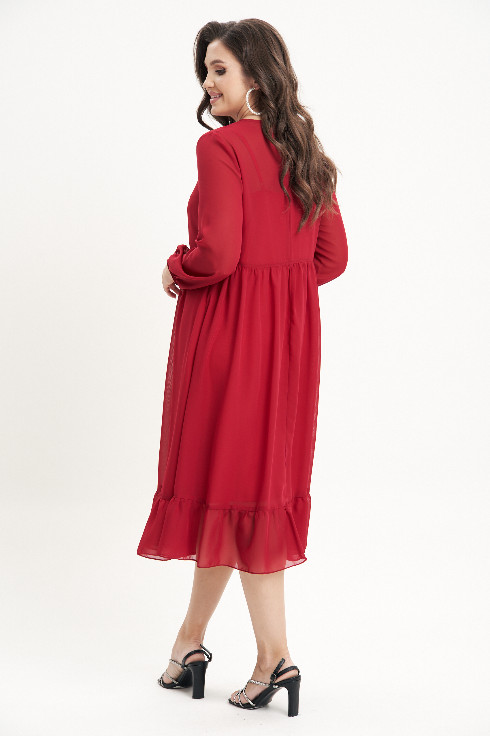 Современная мода диктует новые правила: платья из шифона плавно из нарядных перешли в наш повседневный гардероб. Прогулка летним вечером и в не жаркий день в такой одежде - одно удовольствие, лёгкое, струящееся полотно изящно создает ощущение воздушности. Свободный, упрямлённый силуэт, втачной покрой, отрезной лиф, чуть выше линии талии.Нижняя часть платья - коническая со сборкой. По низу платья - притачной волан. Спинка со средним швом и застёжкой.Рукав с манжетой и сборкой. Нижнее платье из подкладочной вискозы, А-силуэта, на регулирующихся бретелях.Длина платья около 117 см. Длина рукава около 60 см.Длина нижнего платья около 102 см.