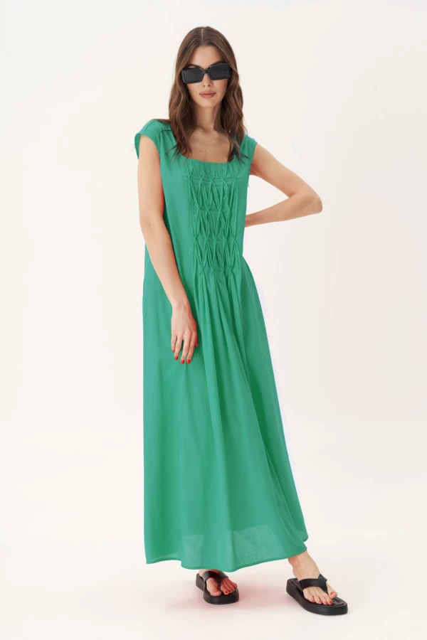 Красивое, воздушное платье… Это то, что находится в нашем гардеробе не только для настроения, но и для самоощущения. Масштабируя женственность, оно дарит уверенность в себе, лёгкую походку, грацию…Свободный А-силуэт, покрой с заниженной линией плеча, длина макси. Полочка с эффектным вырезом и авторскими сложными буфами. Спинка - со средним швом.Длина платья около 130 см.