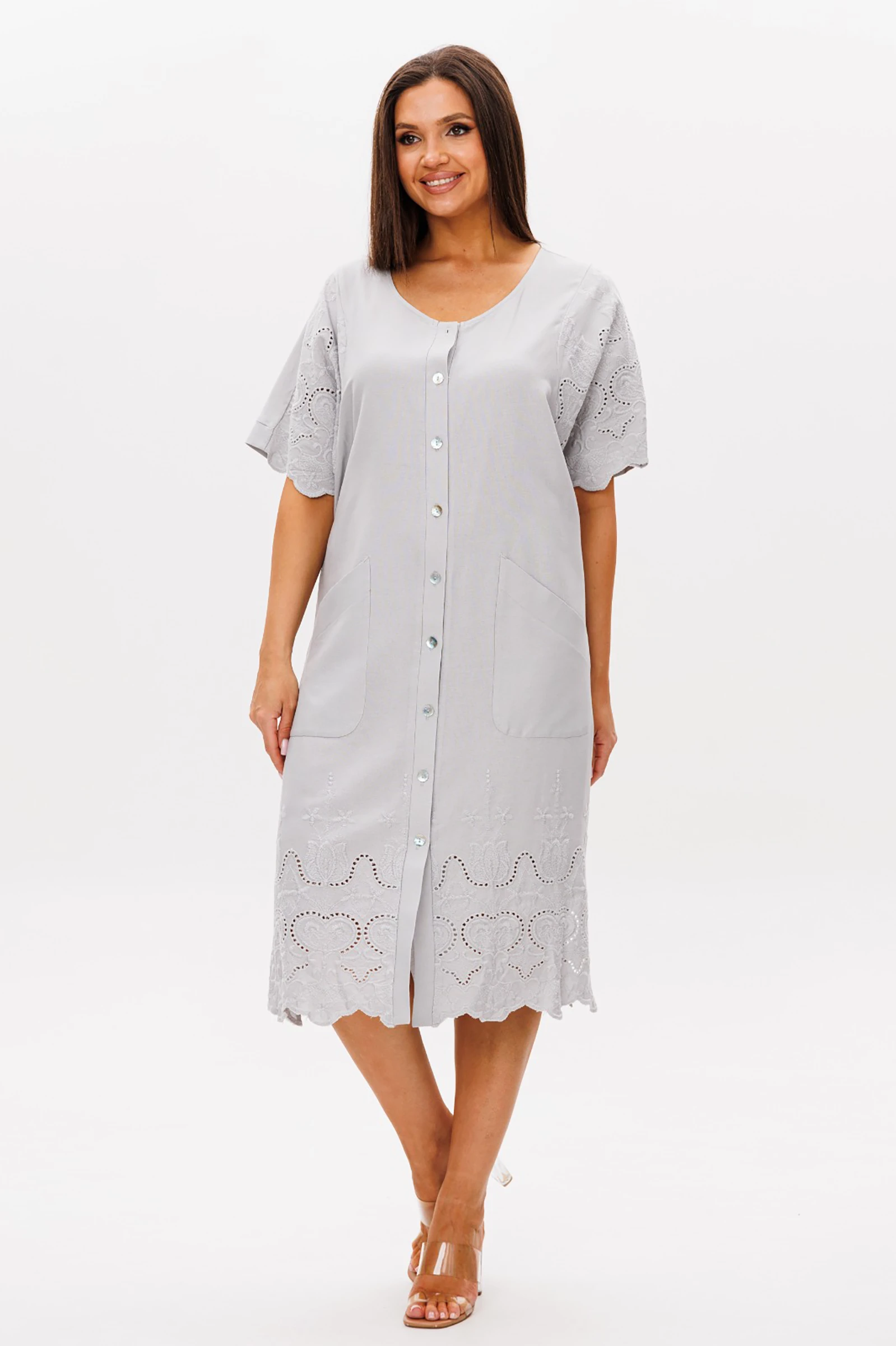 Это платье не оставит вас незамеченной ни в одной ситуации. Эффект, который оно производит, заслуживает того, чтобы обязательно включить такую модель в свой повседневный гардероб. Простота кроя - секретный код, которым обладает это платье. Силуэт свободный, расширенный, покрой - цельнокроенный, застёжка центральная на пуговицы. Полочки с накладными большими карманами, спинка с отрезной кокеткой, цельнокроенной с рукавом, и средним швом. По боковым швам - разрезы. Кокетка полочки и спинки из отделочной ткани. Длина платья около 105 см. Длина рукава с плечом около 40 см.