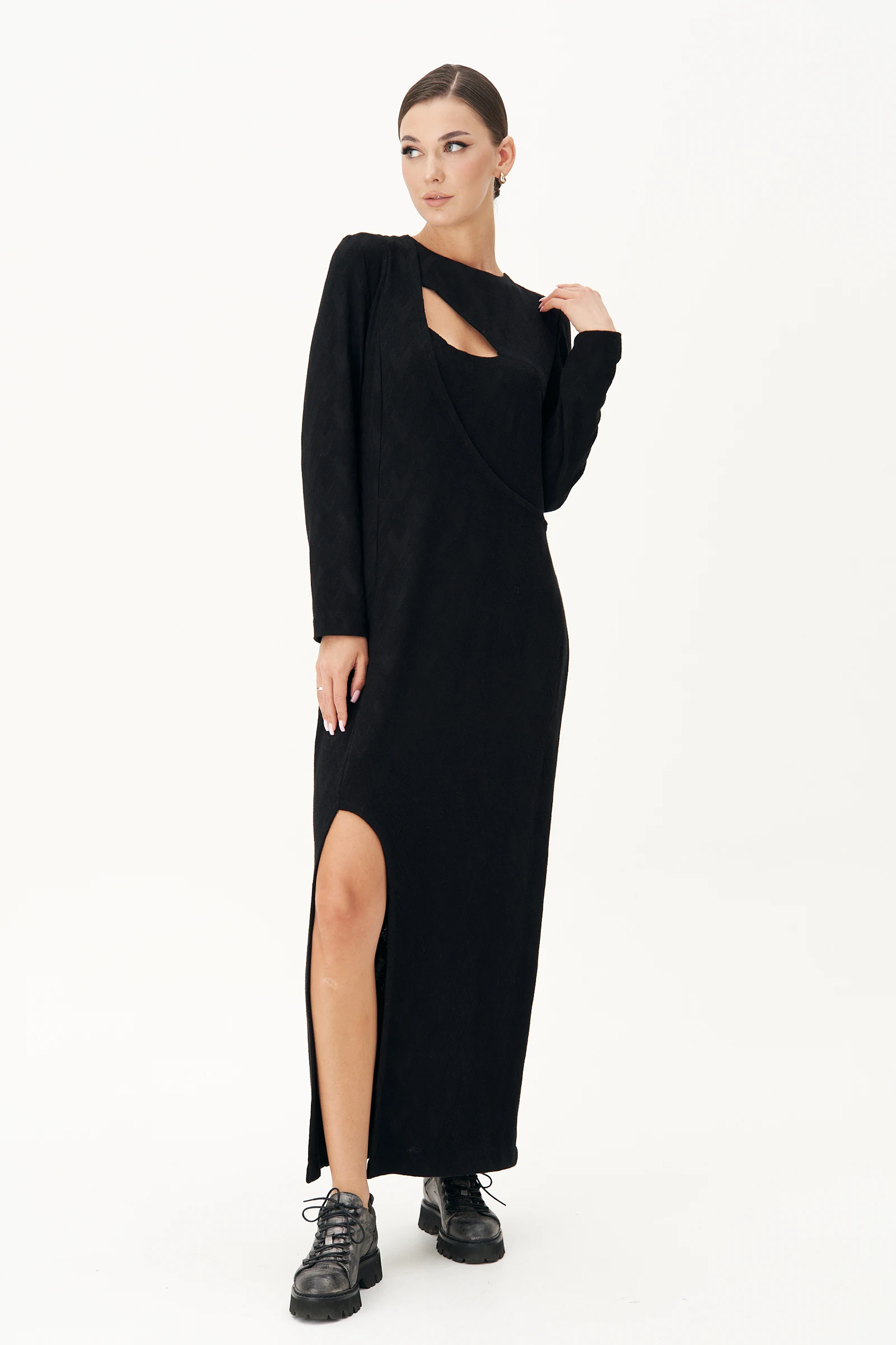 Модная осень сменяет модное лето, но непременно остаётся не менее эффектной и стильной. Элегантное трикотажное платье полуприлегающего силуэта с трендовым разрезом - открывающим загадочно ногу, и вырезом деликатно приоткрывающий зону декольте. Ассиметричный, сложный крой модели: односторонний рельеф, оригинальный подрез и отрезная кокетка с одной стороны полочки, преображают, казалось бы простое чёрное платье в необычно актуальное. Длина платья около 130 см.Длина рукава около 62 см.